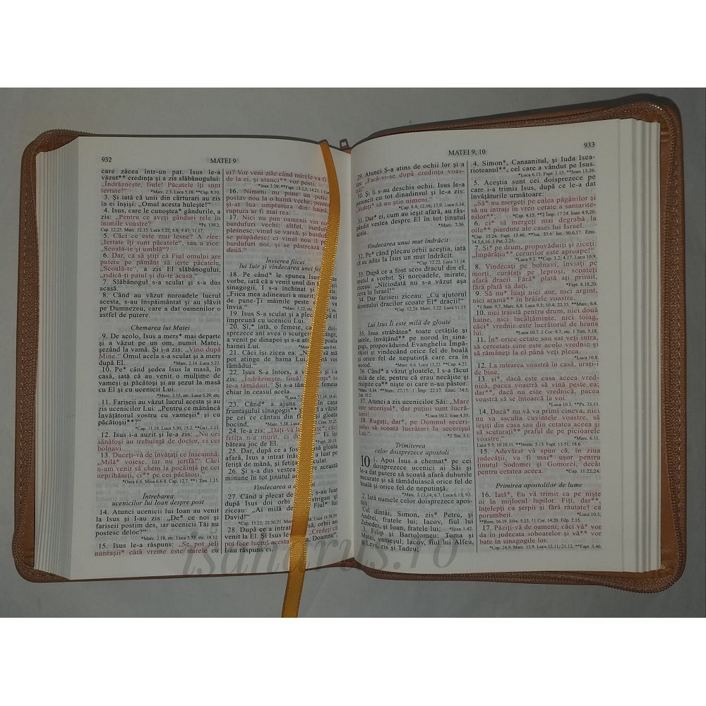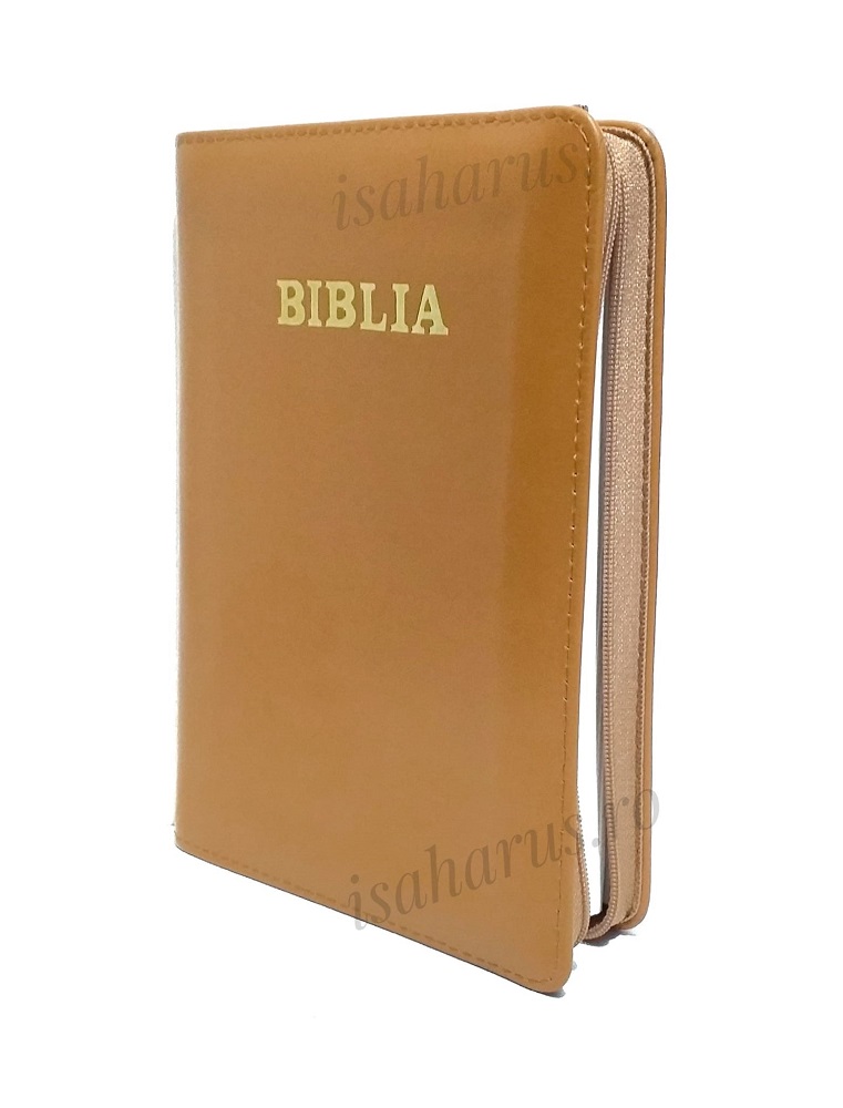 Biblia sau Sfânta Scriptură a Vechiului și Noului Testament cu trimiteri. Biblie medie, copertă din piele cărămiziu, cu fermoar, margini albe, fără index.