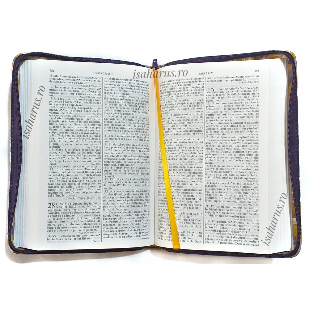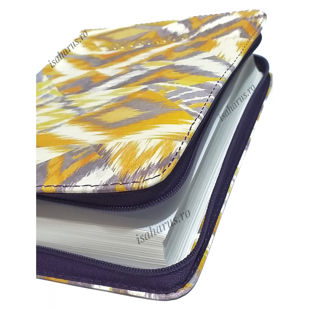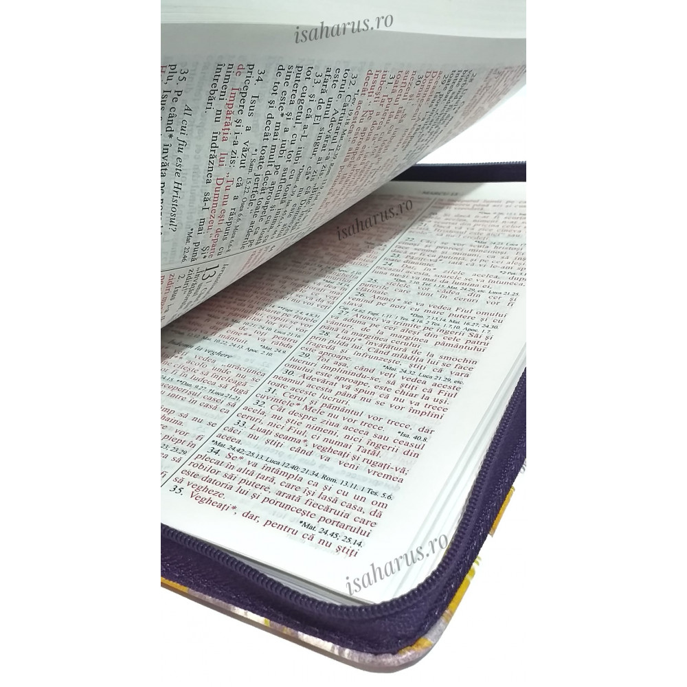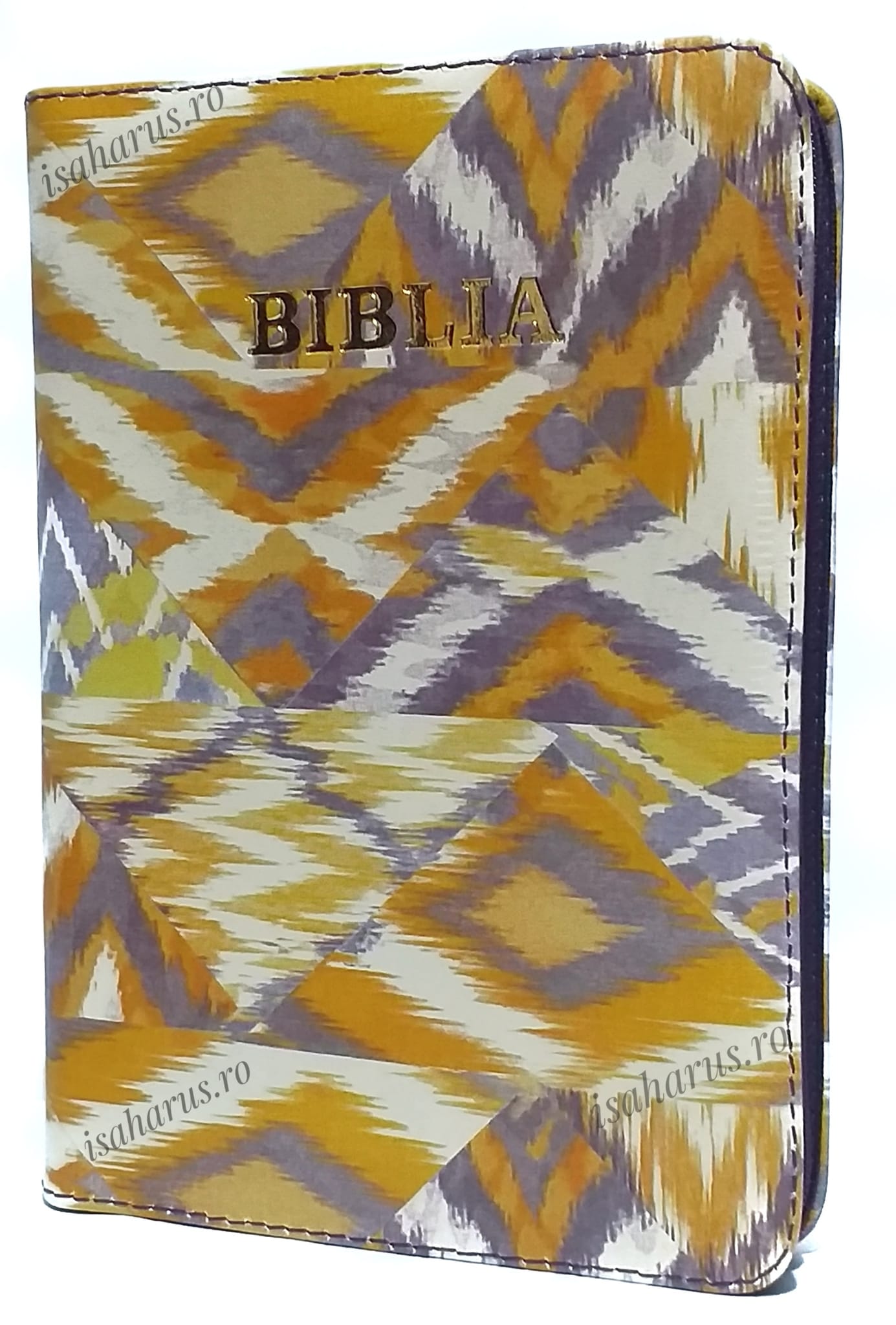 Biblia sau Sfânta Scriptură a Vechiului și Noului Testament cu trimiteri. Biblie medie, copertă cu model abstract, maro, cu fermoar, margini albe, fără index.