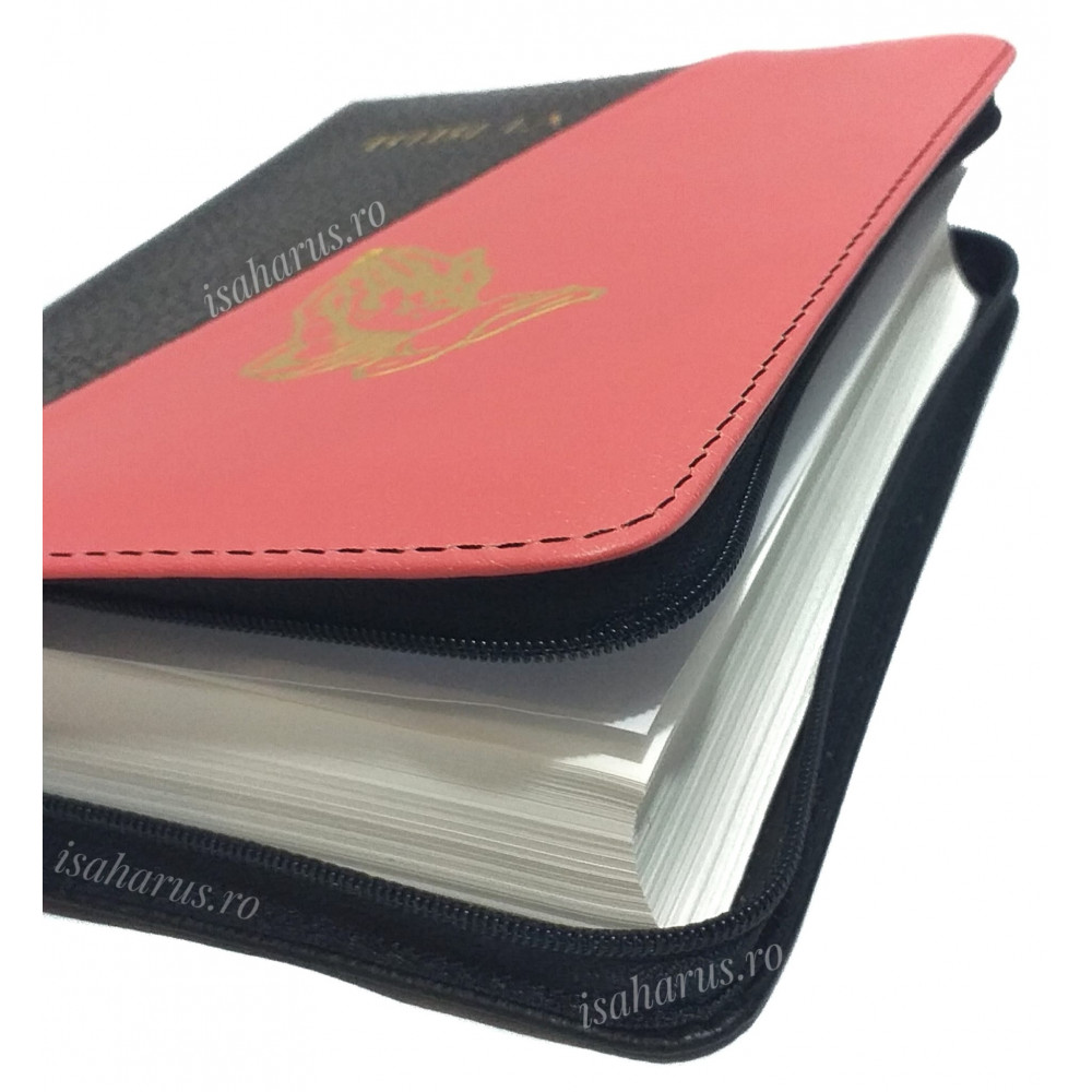 Biblia sau Sfânta Scriptură a Vechiului și Noului Testament cu trimiteri. Biblie medie, copertă din piele negru/coral, cu fermoar, margini albe, fără index, mâini în rugăciune.