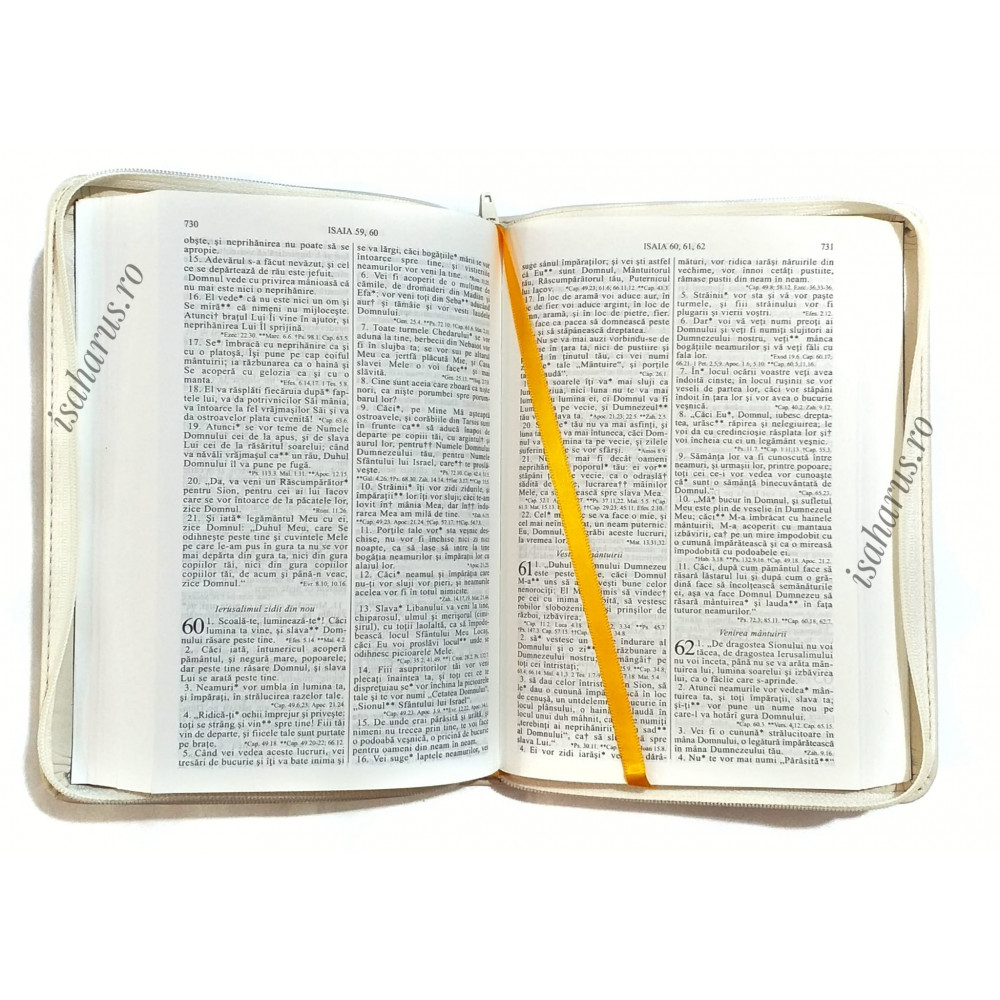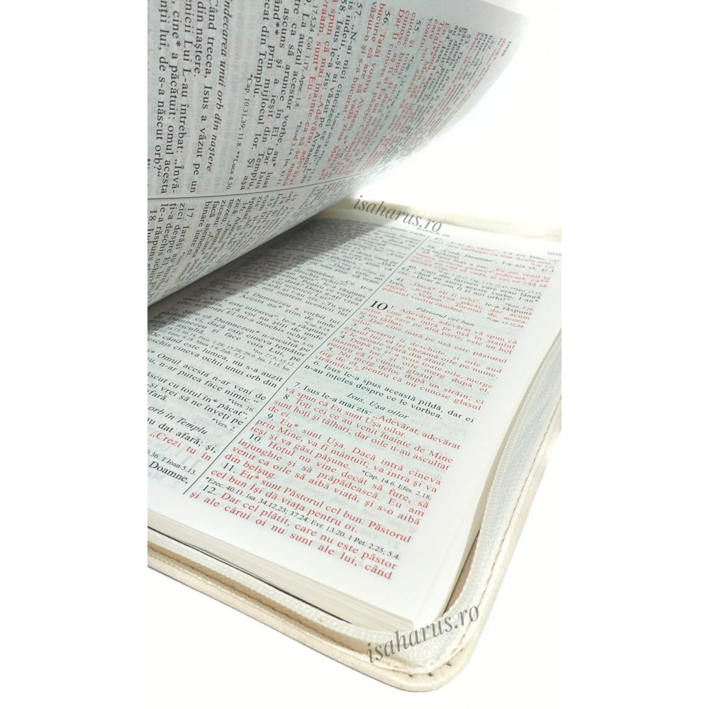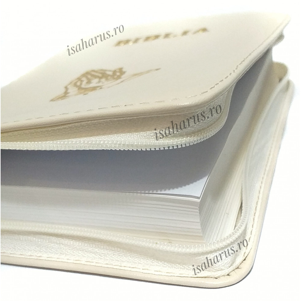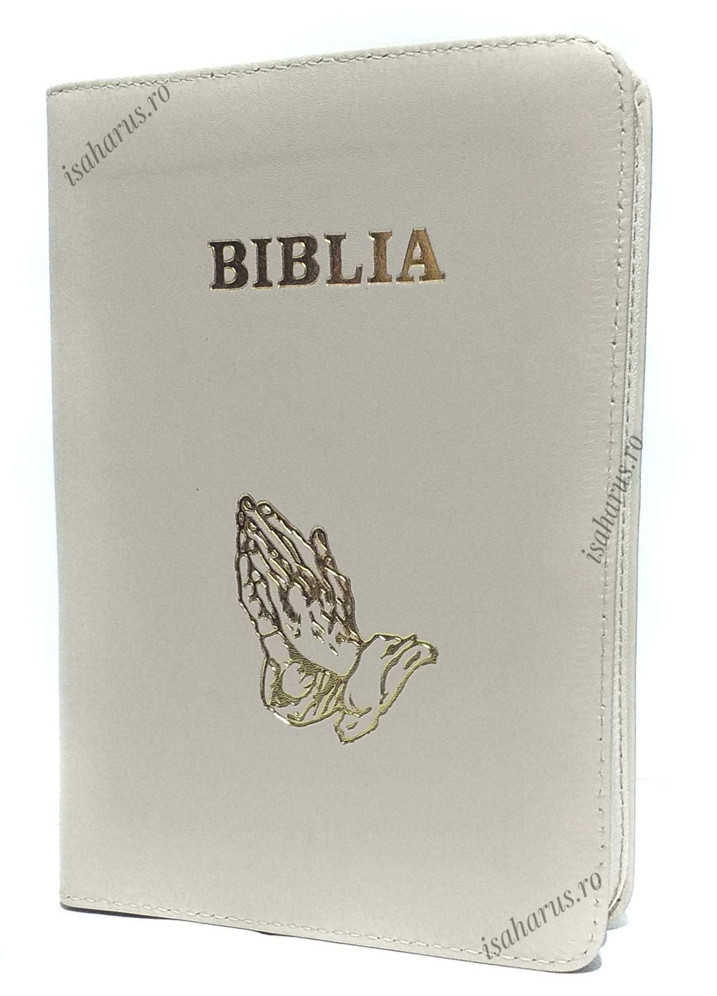 Biblia sau Sfânta Scriptură a Vechiului și Noului Testament cu trimiteri. Biblie medie, copertă din piele ivory, cu fermoar, margini albe, fără index, mâini în rugăciune.