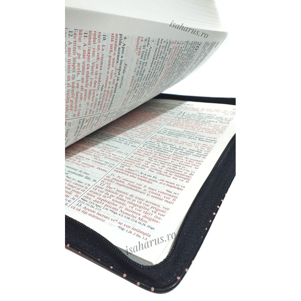 Biblia sau Sfânta Scriptură a Vechiului și Noului Testament cu trimiteri. Biblie medie, copertă neagră cu buline roz, cu fermoar, margini albe, fără index.