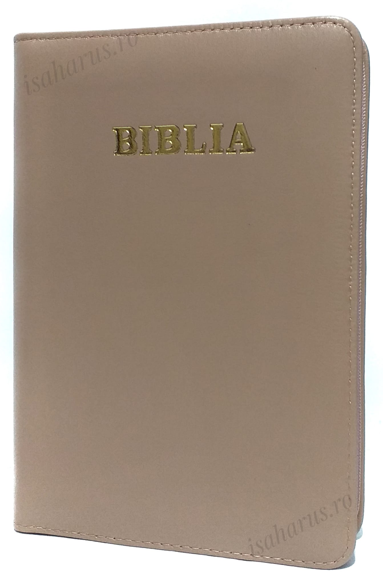 Biblia sau Sfânta Scriptură a Vechiului și Noului Testament cu trimiteri. Biblie medie, copertă din piele roz pudrat, cu fermoar, margini albe, fără index.