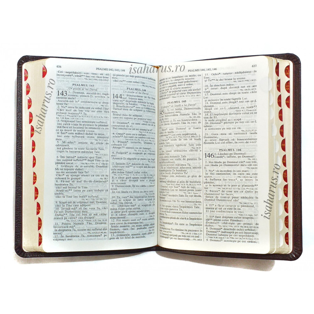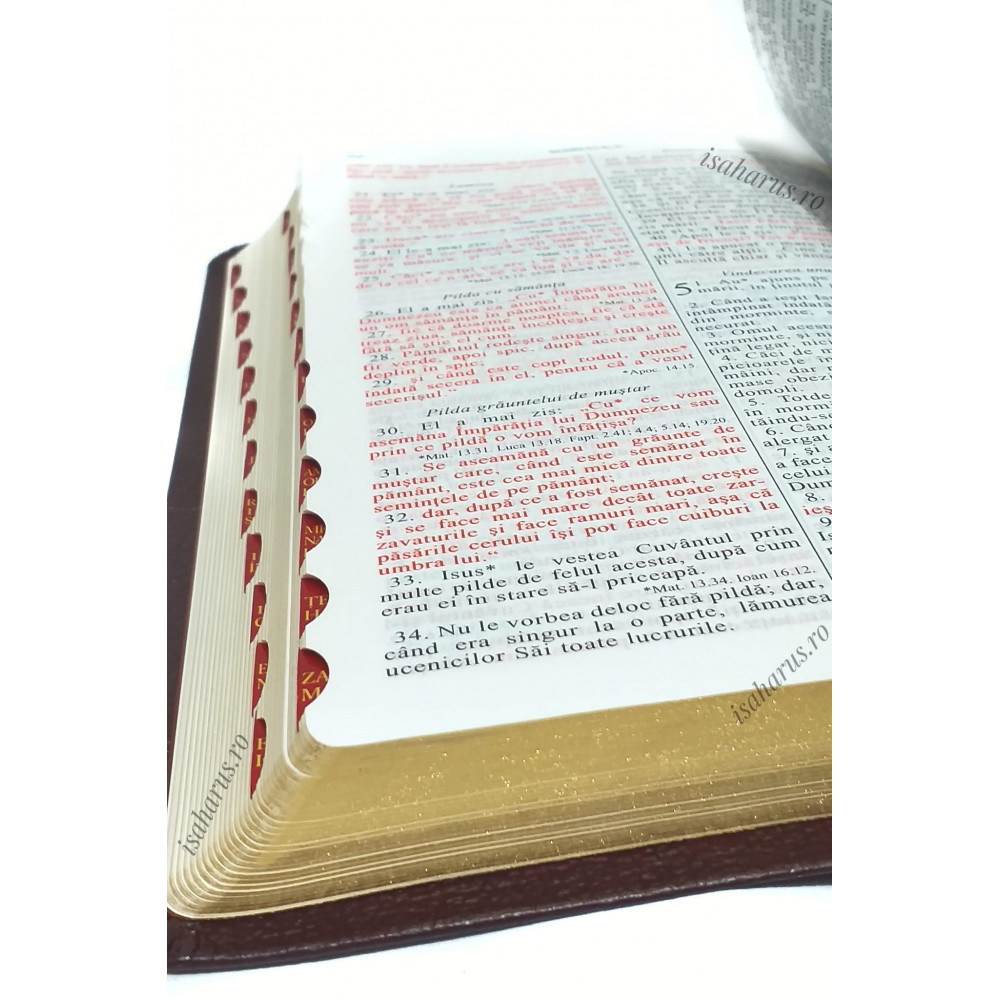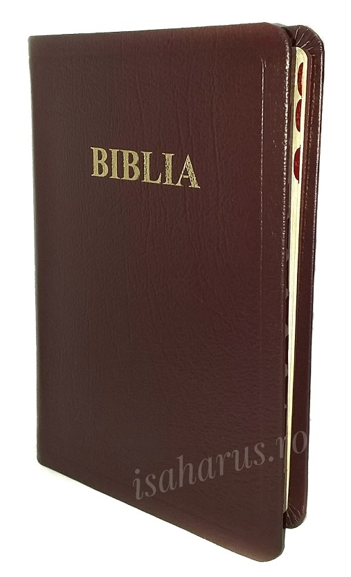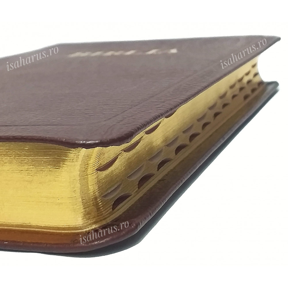Biblia sau Sfânta Scriptură a Vechiului și Noului Testament cu trimiteri, format mediu, copertă din piele, margini aurii și index.