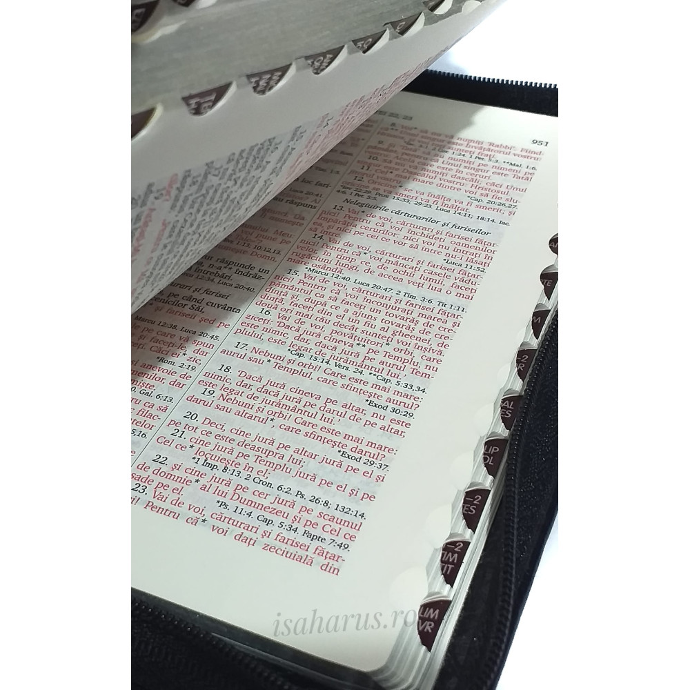Sfânta Scriptură a Vechiului și Noului Testament cu trimiteri. Ediţia de faţă reprezintă o nouă culegere a textului cu îndreptări ortografice, ortoepice, gramaticale şi de punctuaţie, respectând în întregime opera traducătorului. Primele patru pagini din Biblie conţin părţi din istoria traducerii Sfintei Scripturi în limba română şi locul, în istorie, pe care îl ocupă Biblia Cornilescu.