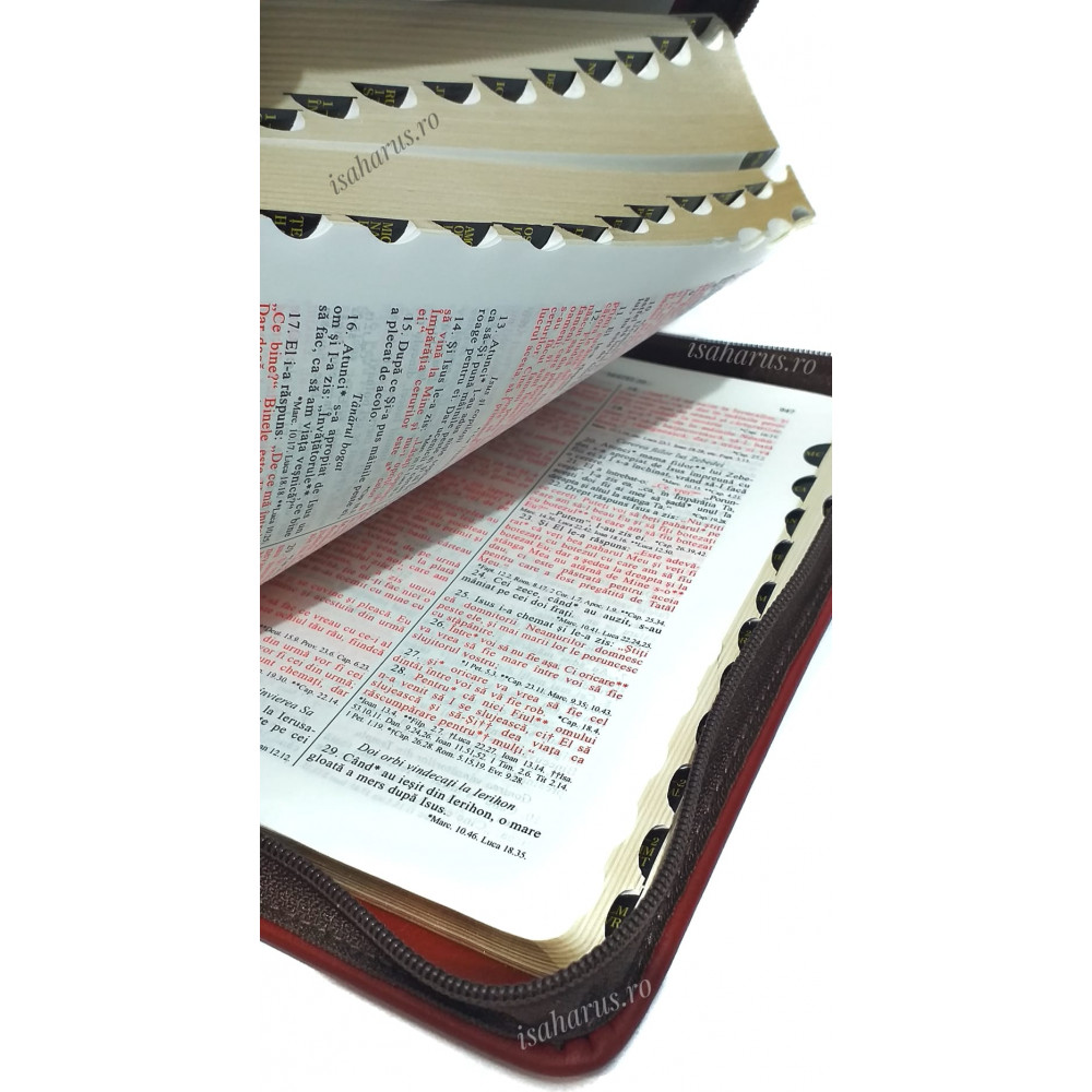 Biblia sau Sfânta Scriptură a Vechiului și Noului Testament cu trimiteri. Traducere Dumitru Cornilescu, ediție revizuită ortografic. Biblia format mic, copertă piele vișinie, margini aurii, index și fermoar.