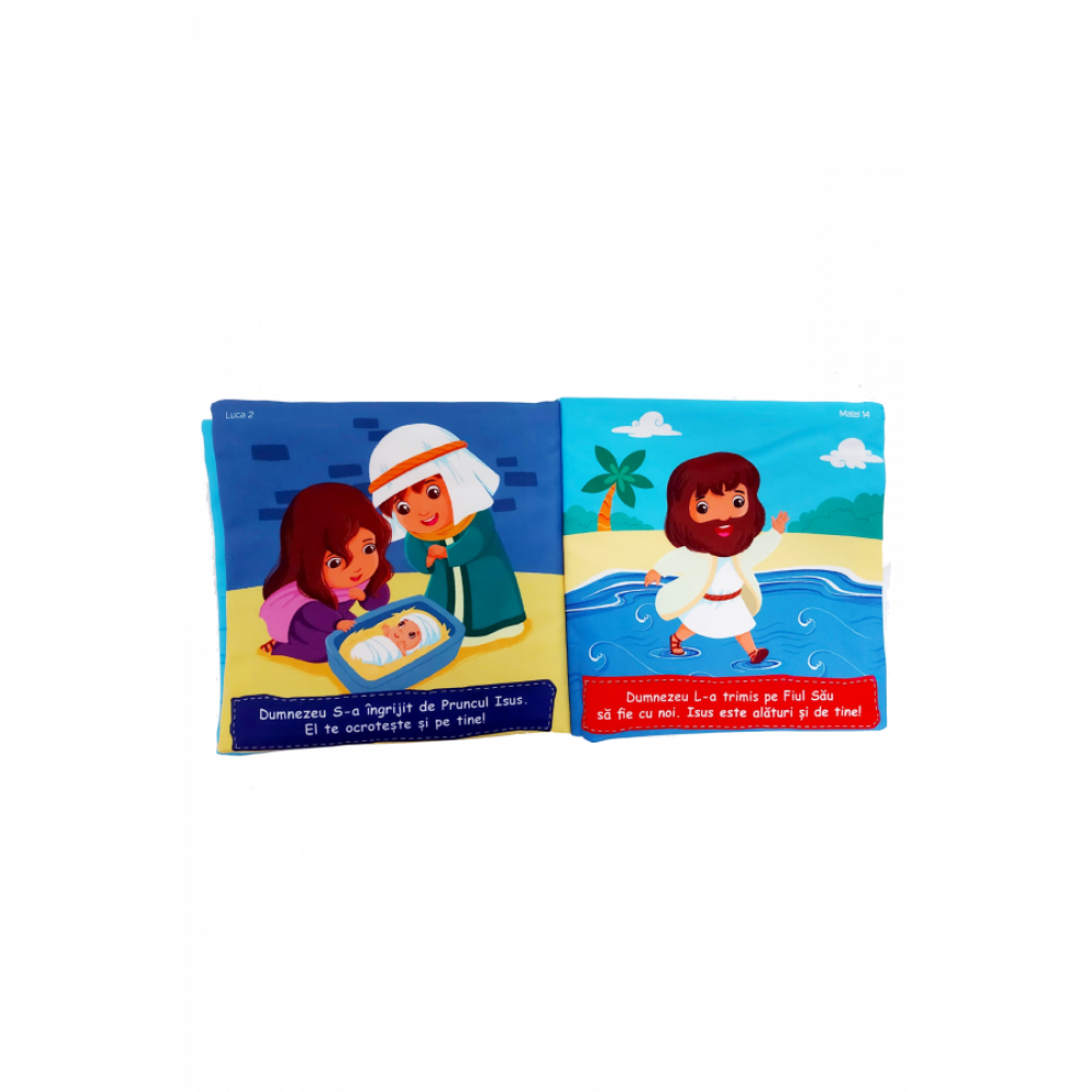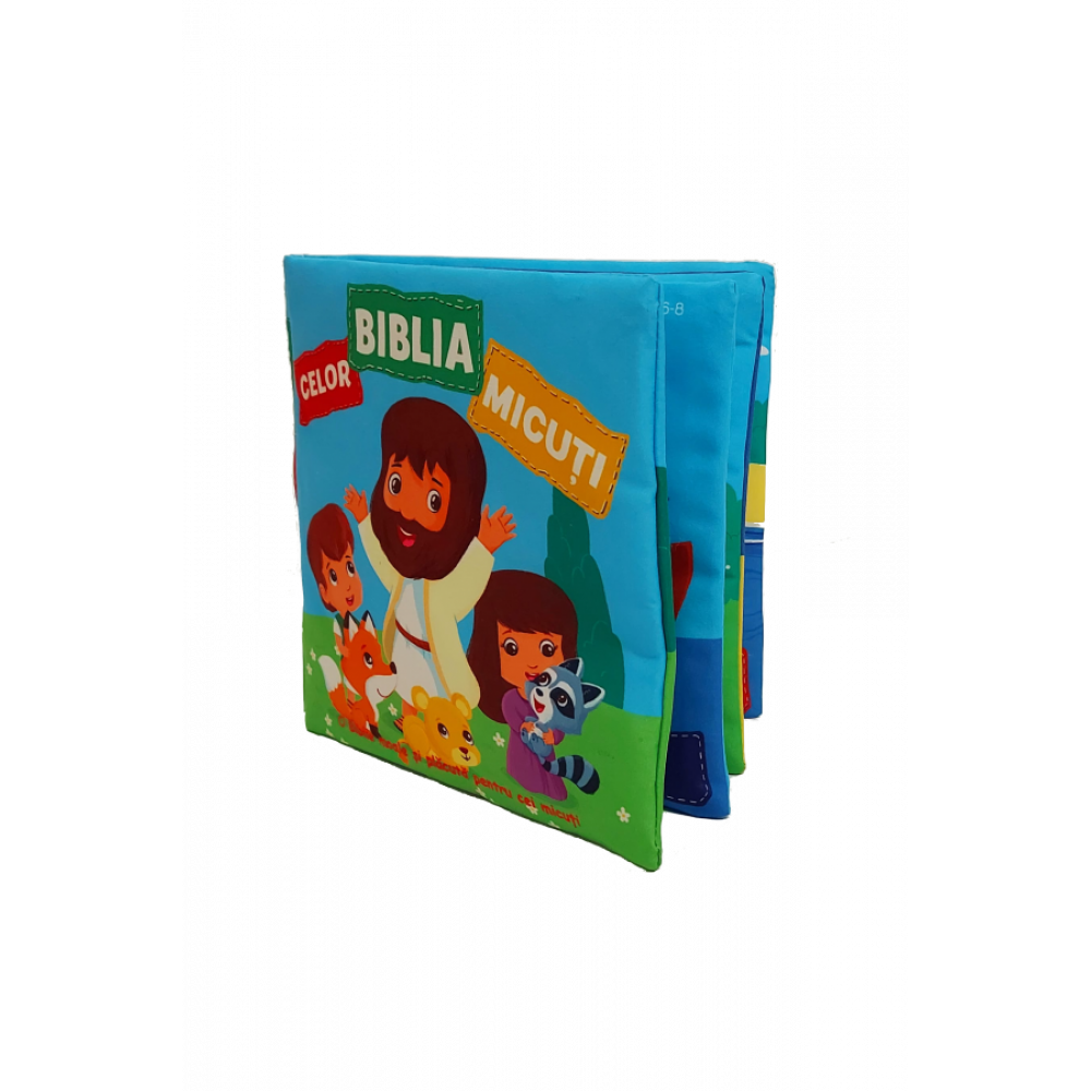 O carte destinată micuților de 0-3 ani, care îi întâmpină cu imagini și culori atrăgătoare, familiarizându-i cu marile evenimente din istoria biblică, și toate acestea prezentate sub forma unei cărțulii din material, astfel încât să încânte nu doar simțul vizual al celor mici, ci și pe cel tactil, pe cel auditiv, întrucât coperțile sunt prevăzute la interior cu folie foșnitoare și, de ce să nu fim sinceri?, chiar pe cel „gustativ”. Realizată din material textil netoxic cartea poate deveni și prietena de nădejde în perioada eruperii dentiției. Cel mic o poate mușca fără probleme și fără riscul de a se răni, materialul fiind suficient de moale și plăcut la atingere. Culorile folosite pentru imprimarea textului și a imaginilor sunt de asemenea certificate ca netoxice.
