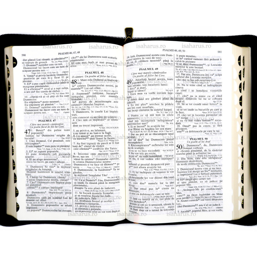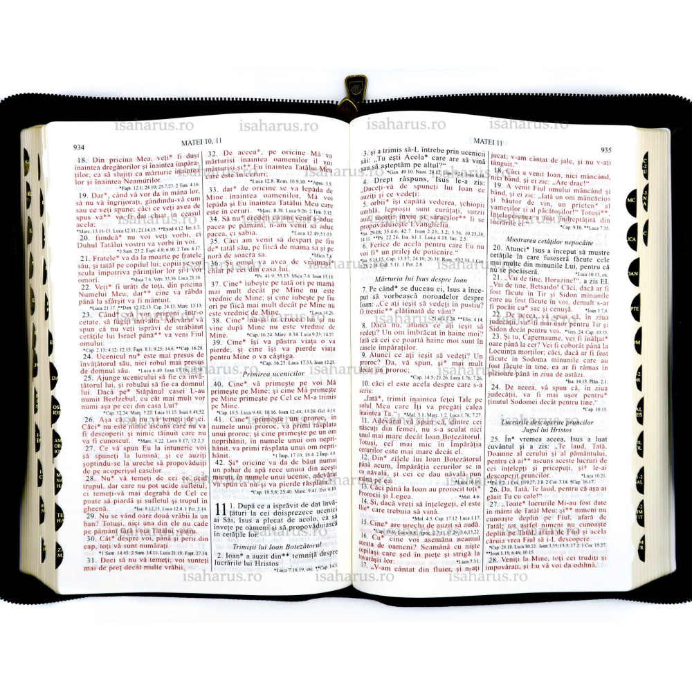 Biblia sau Sfânta Scriptură a Vechiului și Noului Testament, traducerea Dumitru Cornilescu revizuită ortografic, cu concordanță și explicații și cuvintele Domnului Isus scrise cu roșu. Ediția de lux este prevăzută cu copertă naturală din piele (cu fermoar), margini aurite, index de căutare lateral și materiale ajutatoare de studiu.