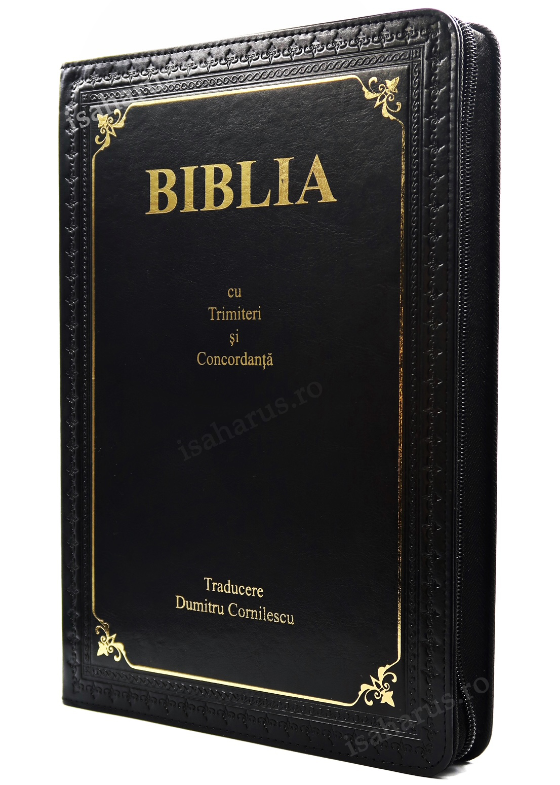 Biblia în format foarte mare, de culoare neagră, cu fermoar, margini aurii, fără index de căutare. Conține Noul și Vechiul Testament, dar și trimiteri și concordanță biblică. Textul este traducere Dumitru Cornilescu.