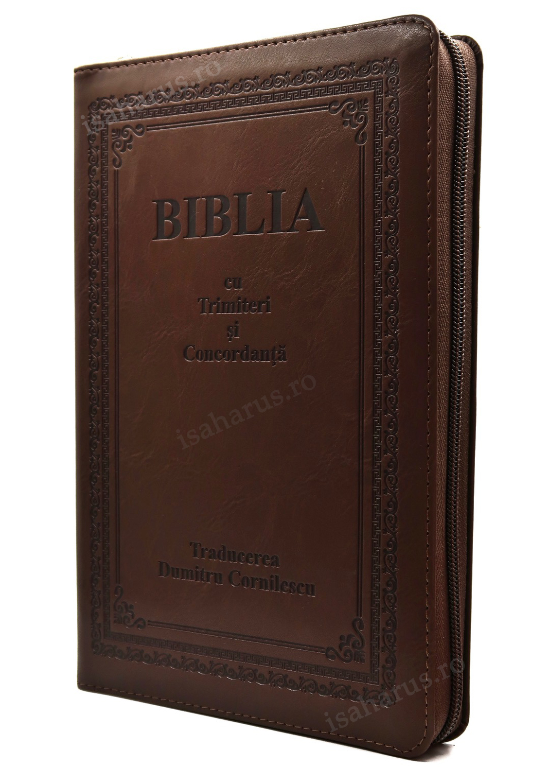 Biblia în format mare, de culoare maro cu text auriu, cu fermoar, margini albe și index de căutare. Conține Noul și Vechiul Testament, dar și trimiteri și concordanță biblică. Textul este traducere Dumitru Cornilescu.