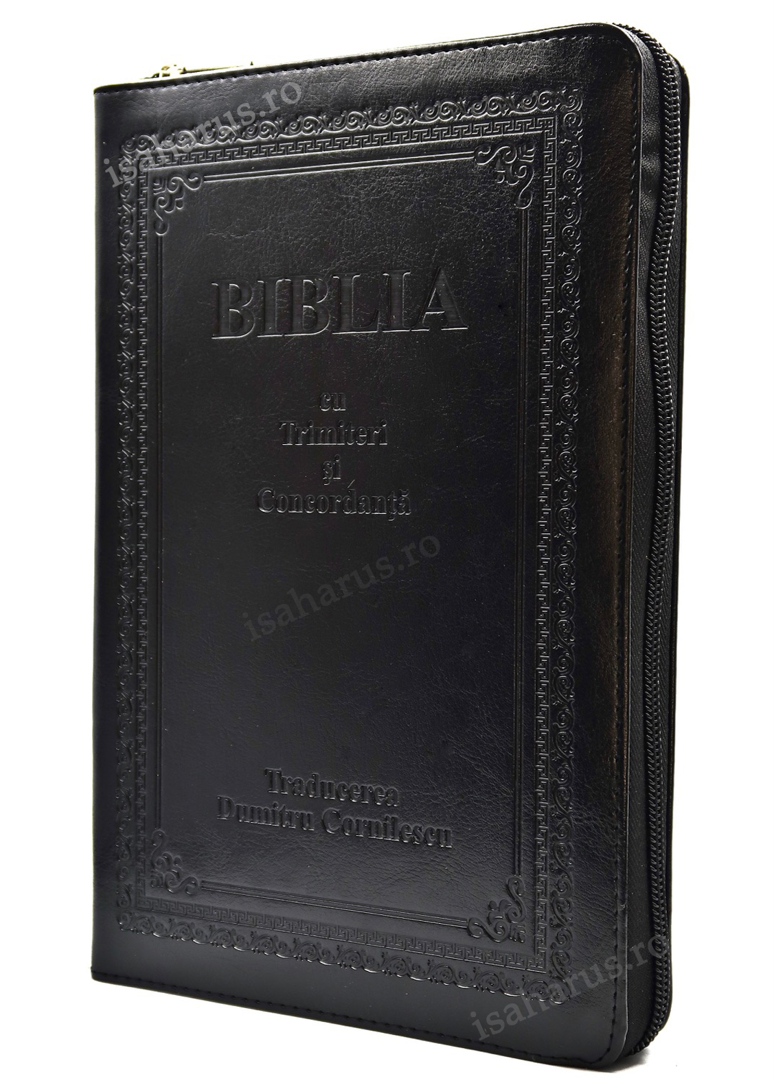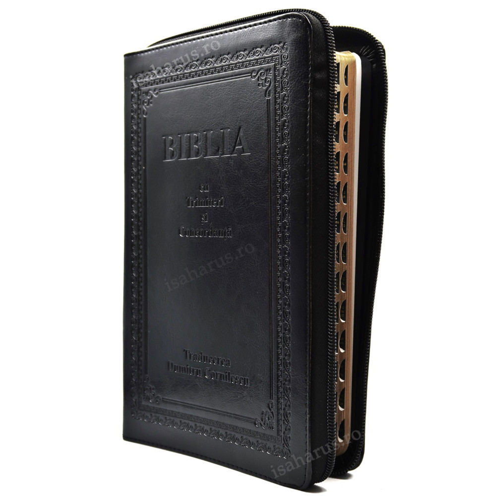 Biblia în format mare, de culoare neagră, cu fermoar, margini aurii și index de căutare. Conține Noul și Vechiul Testament, dar și trimiteri și concordanță biblică. Textul este traducere Dumitru Cornilescu.