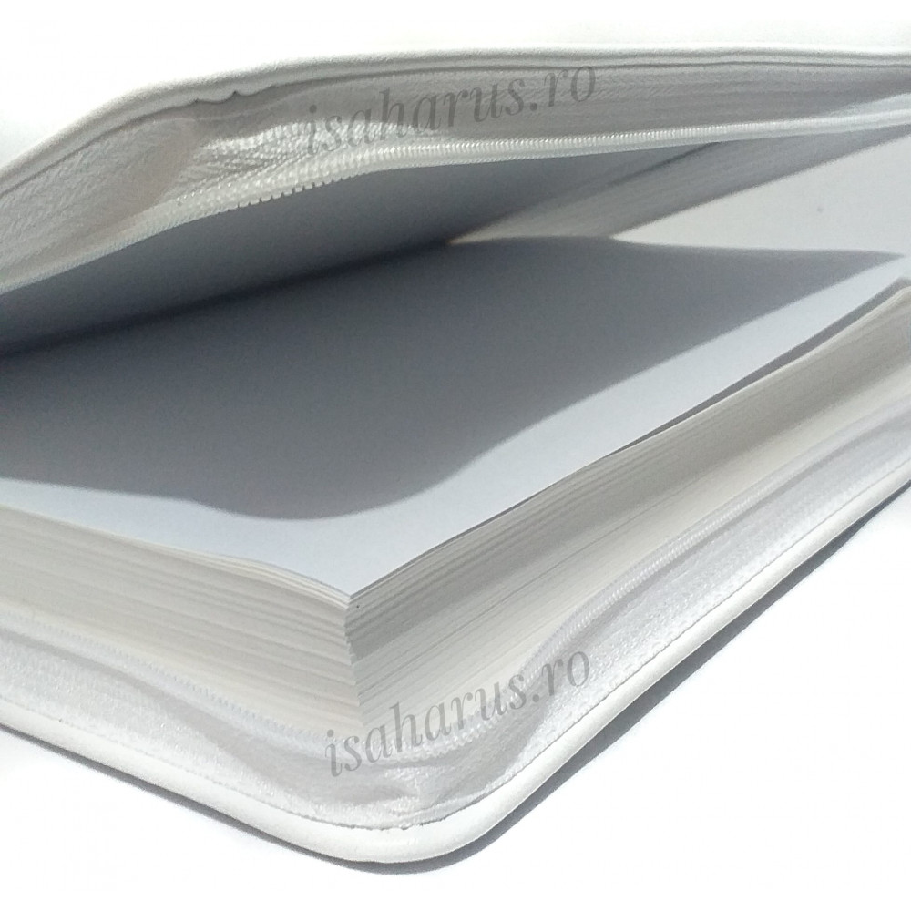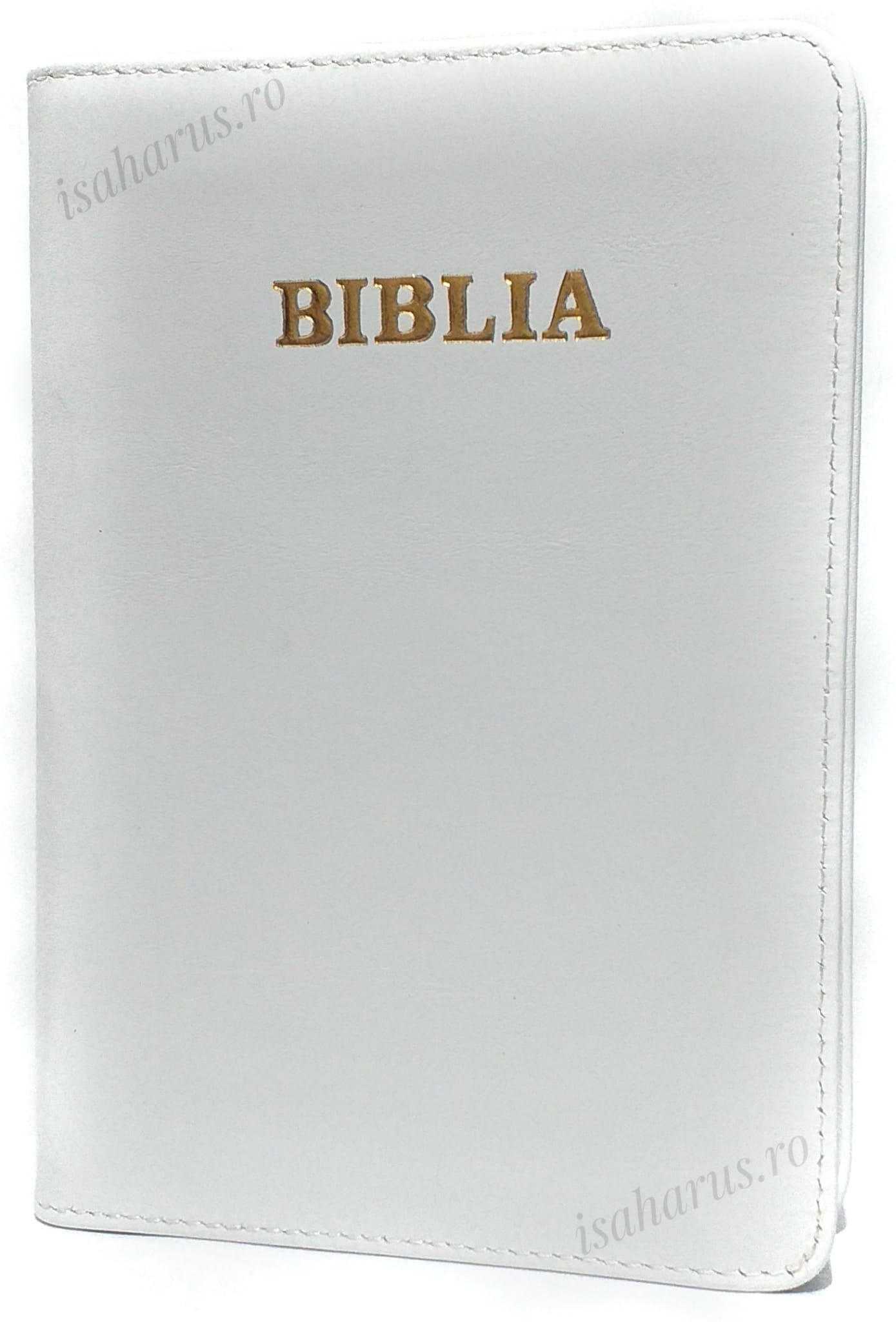 Biblia sau Sfânta Scriptură a Vechiului și Noului Testament cu trimiteri. Biblie medie, copertă din piele albă, cu fermoar, margini albe, fără index.