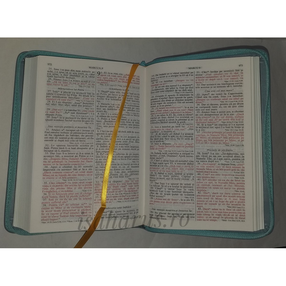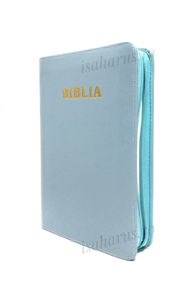 Biblia sau Sfânta Scriptură a Vechiului și Noului Testament cu trimiteri. Biblie medie, copertă din piele albastru deschis, cu fermoar, margini albe, fără index.