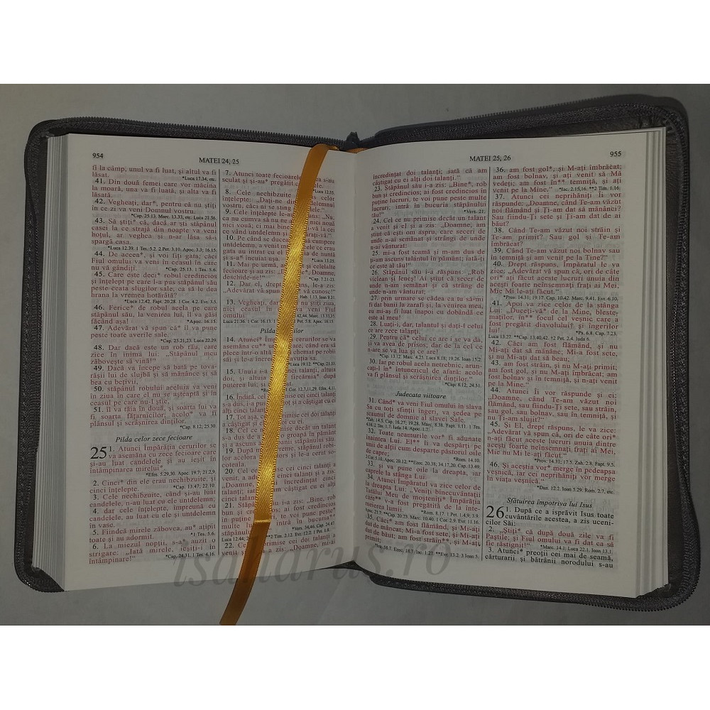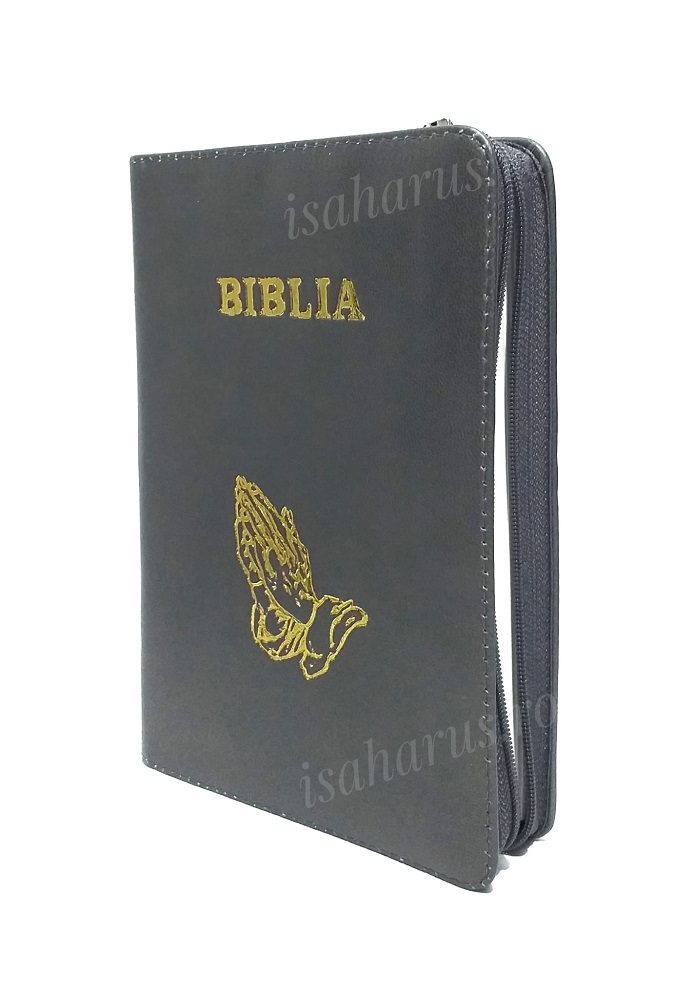 Biblia sau Sfânta Scriptură a Vechiului și Noului Testament cu trimiteri. Biblie medie, copertă din piele gri-petrol, cu fermoar, margini albe, fără index.