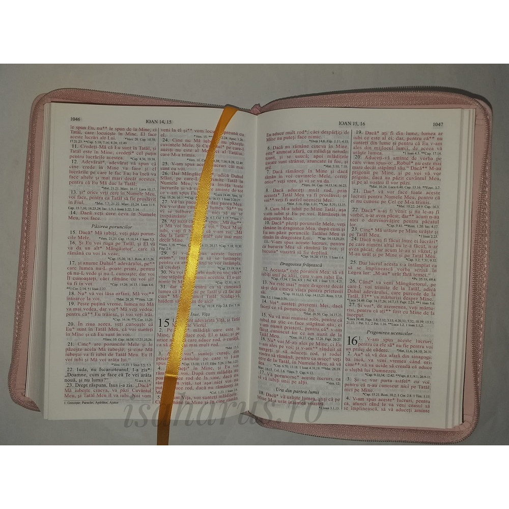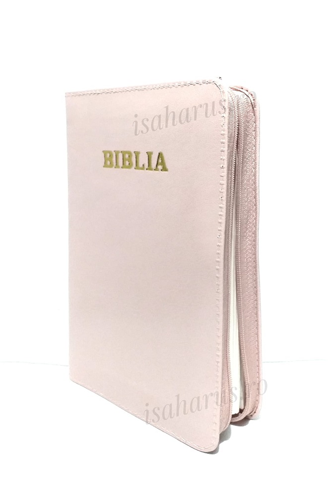 Biblia sau Sfânta Scriptură a Vechiului și Noului Testament cu trimiteri. Biblie medie, copertă din piele roz pal, cu fermoar, margini albe, fără index.