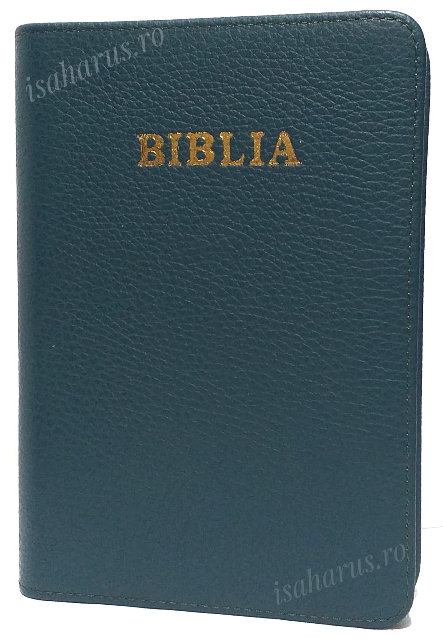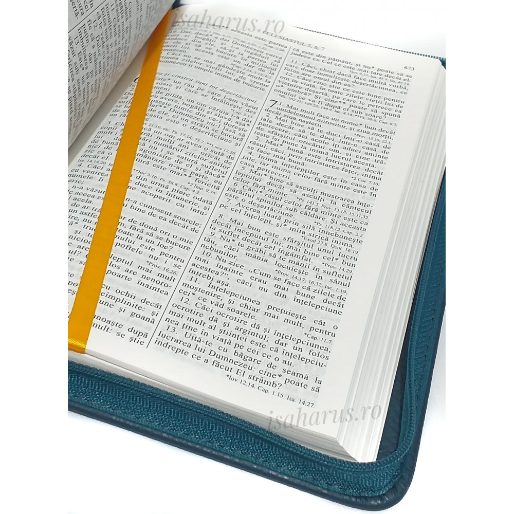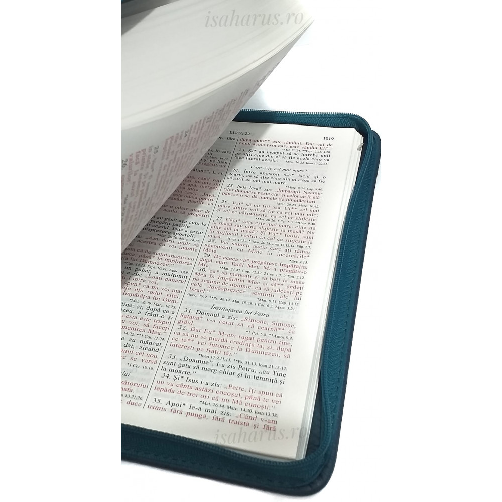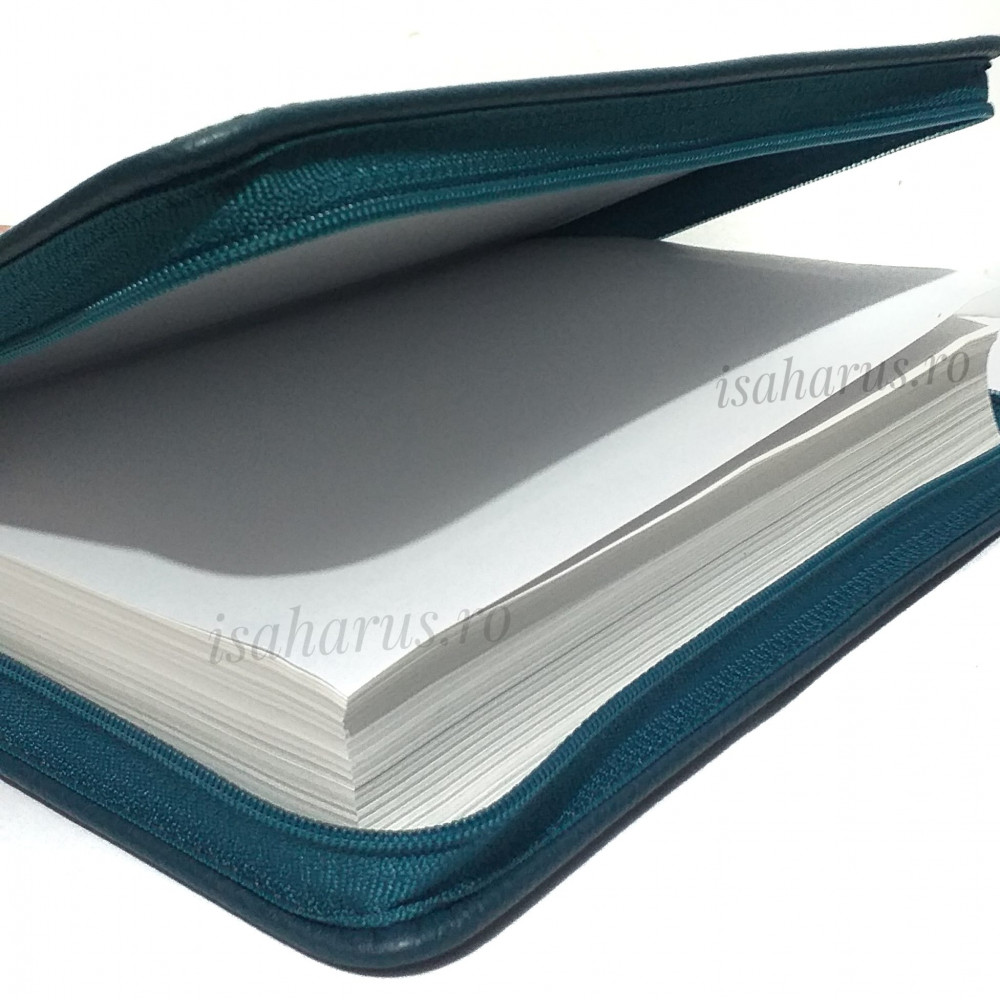 Biblia sau Sfânta Scriptură a Vechiului și Noului Testament cu trimiteri. Biblie medie, copertă din piele verde, cu fermoar, margini albe, fără index.