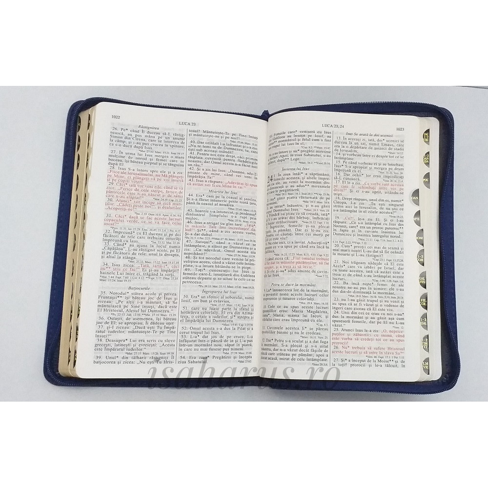 Biblia sau Sfânta Scriptură a Vechiului și Noului Testament cu trimiteri. Biblie medie, copertă piele albastră și fermoar, margini aurii și index.