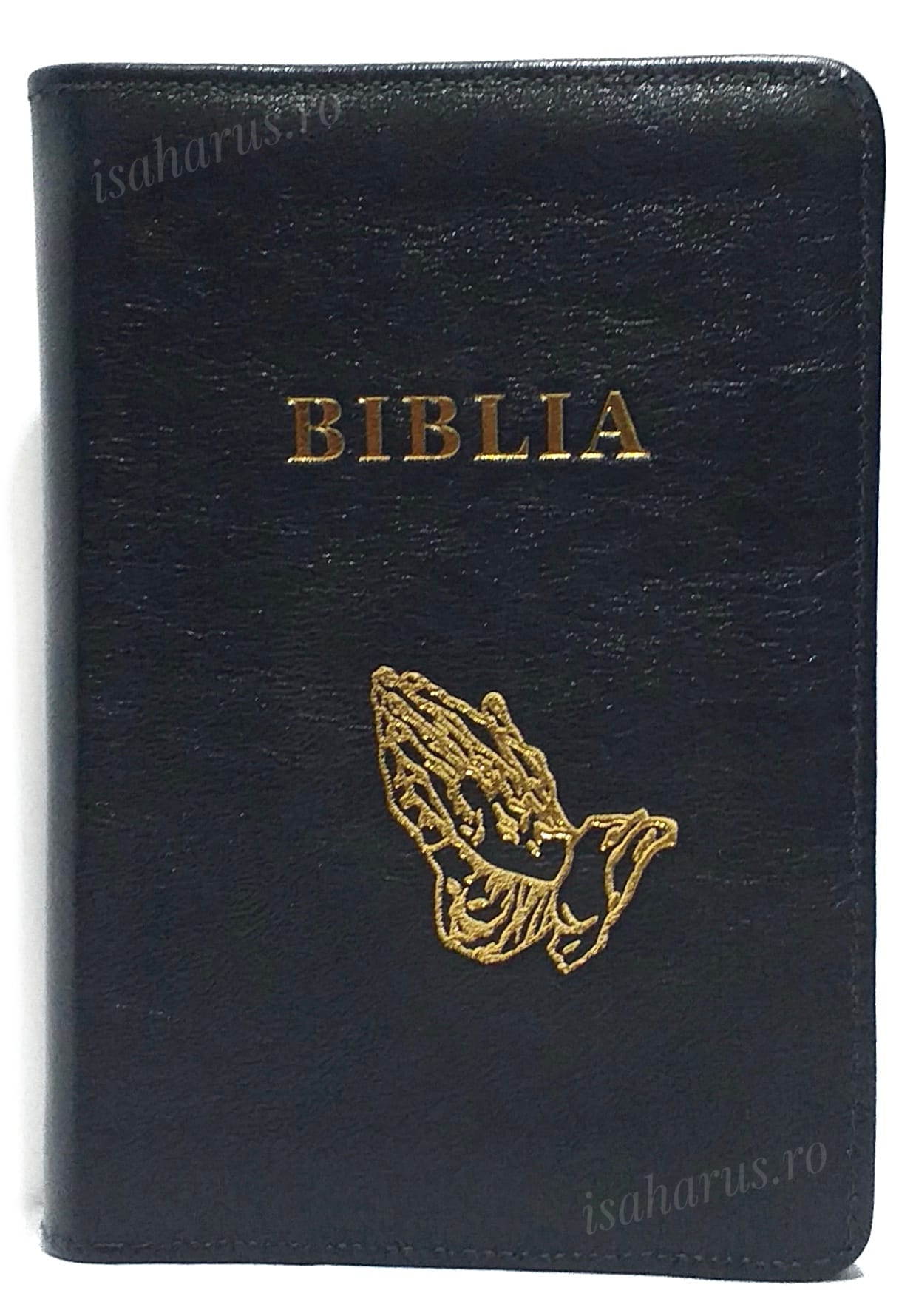 Sfânta Scriptură a Vechiului și Noului Testament cu trimiteri. Traducere Dumitru Cornilescu, revizuită ortografic. Copertă din piele bleumarin cu margini aurii, fermoar și mâini în rugăciune.
