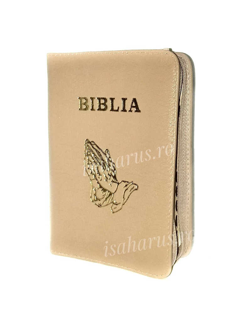 Biblia sau Sfânta Scriptură a Vechiului și Noului Testament cu trimiteri. Traducere Dumitru Cornilescu, ediție revizuită ortografic. Biblia - format mic, copertă piele crem, inscripție mâini în rugăciune, margini aurii, index și fermoar.