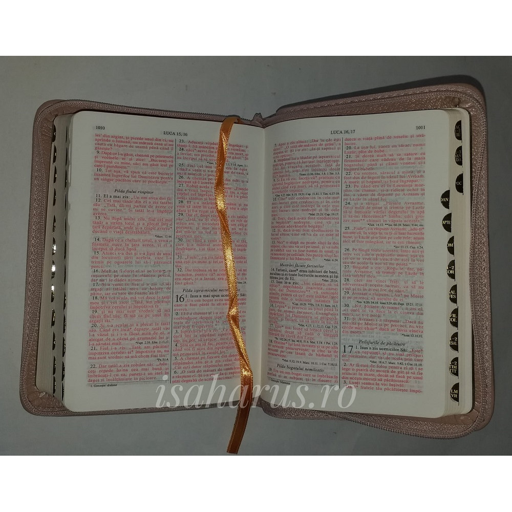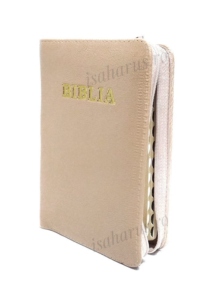Biblia sau Sfânta Scriptură a Vechiului și Noului Testament cu trimiteri. Traducere Dumitru Cornilescu, ediție revizuită ortografic. Biblia - format mic, copertă piele crem, cu margini aurii, index și fermoar.