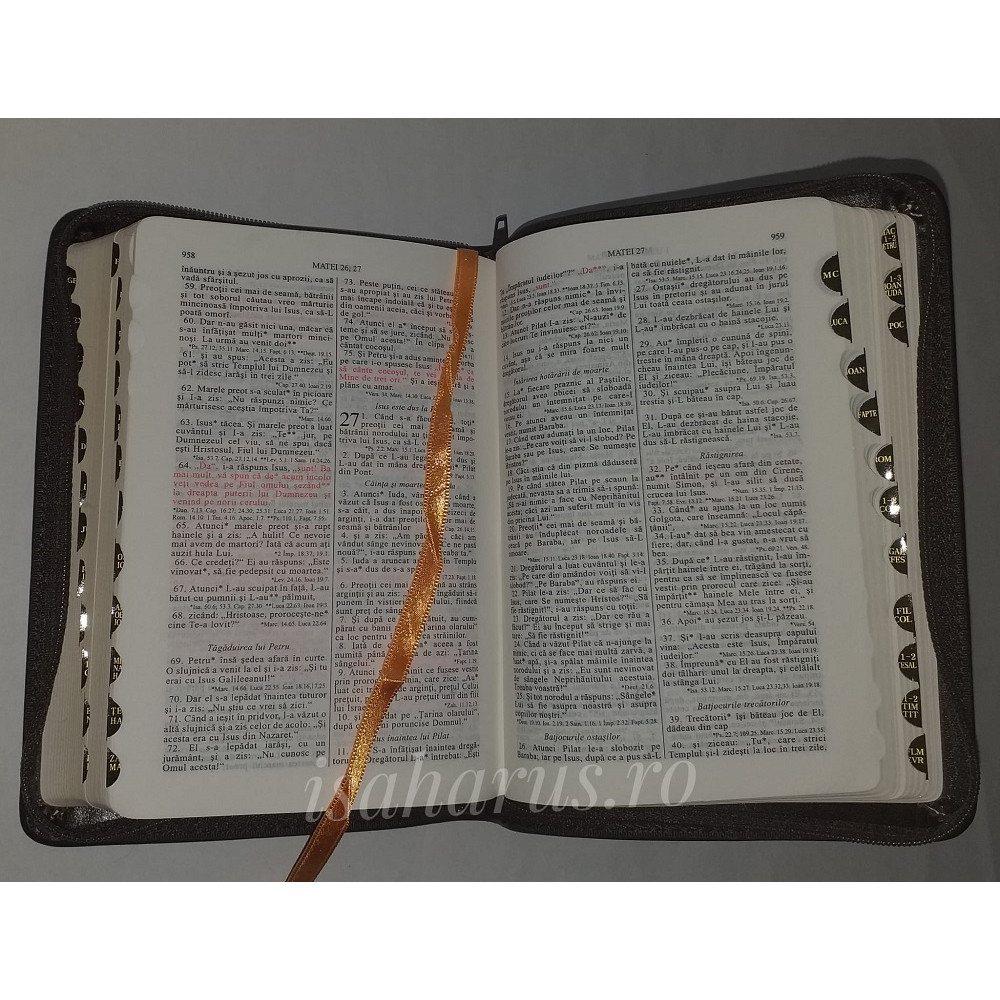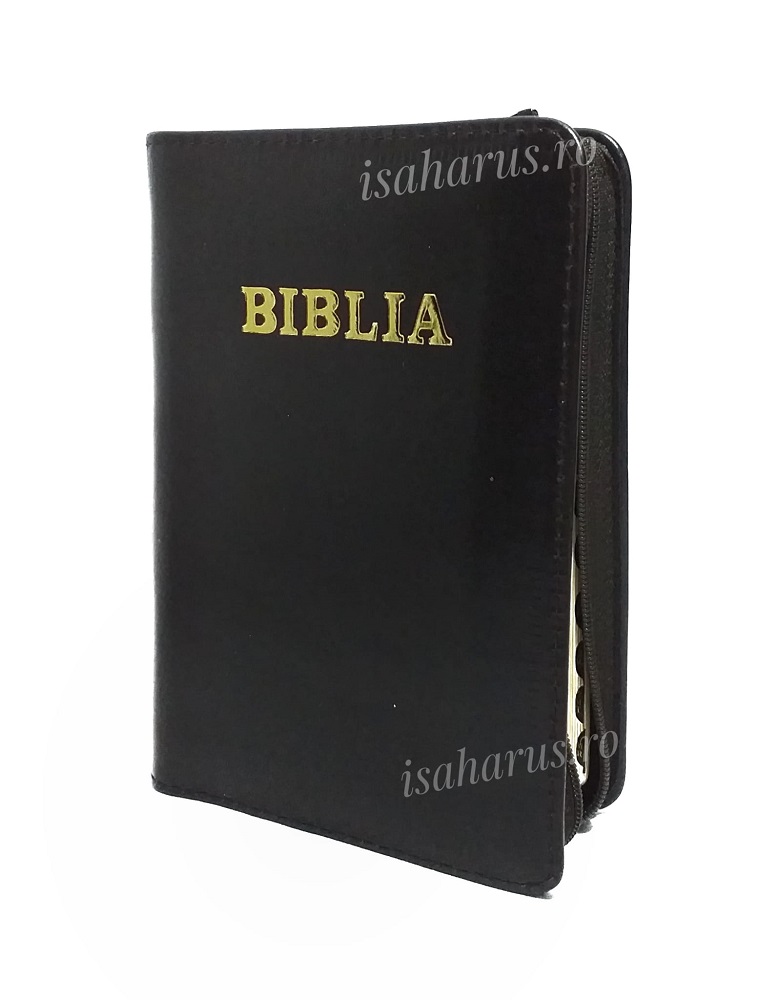 Biblia sau Sfânta Scriptură a Vechiului și Noului Testament cu trimiteri. Traducere Dumitru Cornilescu, ediție revizuită ortografic. Biblia - format mic, copertă piele maro închis, margini aurii, index și fermoar.