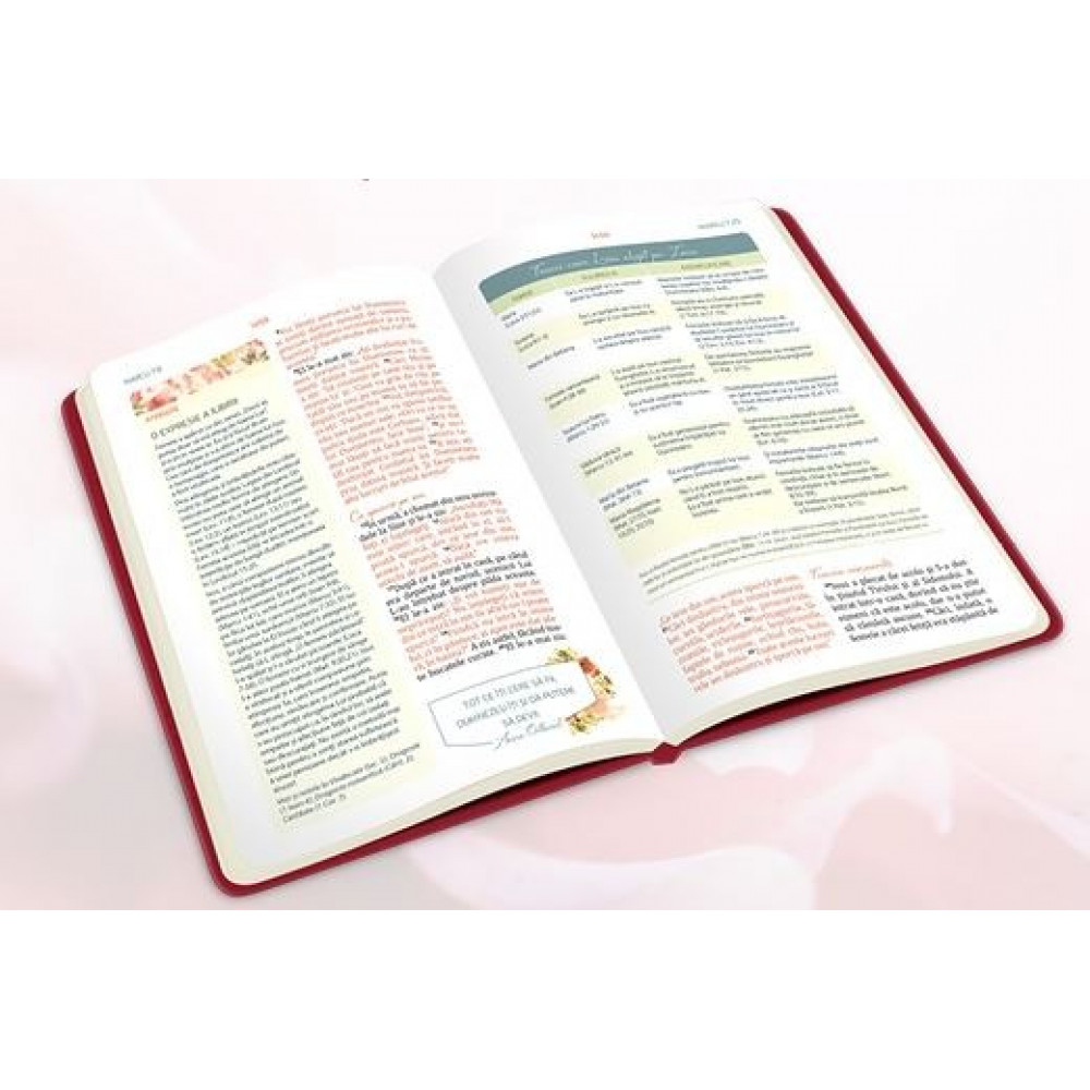 Editie revizuita ortografic, pagini galbui, cu model floral color, si cuvintele Domnului Isus cu rosu,coperta pvc, culoare roz inchis, cu model floral gravat, margini argintii.