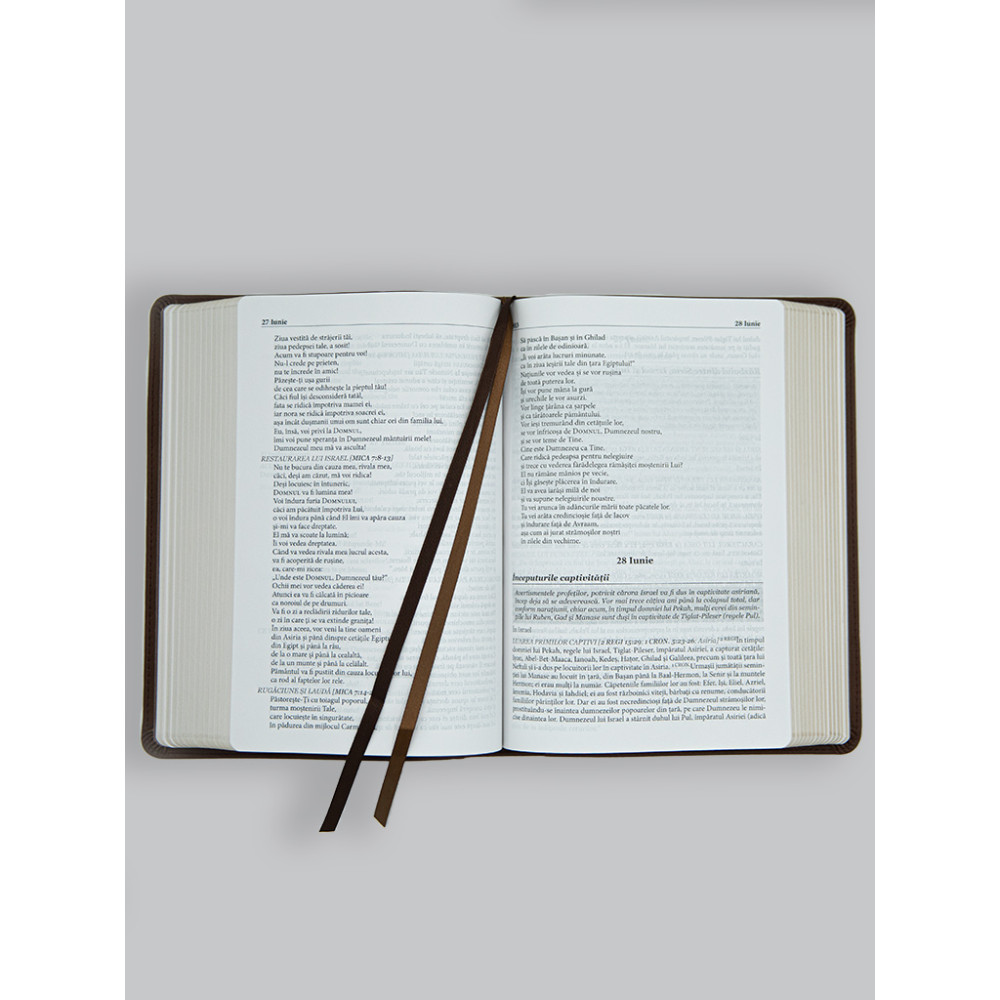 Biblia zilnică [coperta moale maro] te ajuta sa intelegi adevaruri practice, fundamente de credinta si promisiuni biblice. Pe masura ce, zi de zi, vei parcurge Cuvantul lui Dumnezeu sub aceasta prezentare unica, in ordine cronologica a evenimentelor, vei incepe sa apreciezi planul lui Dumnezeu pentru viata ta mai mult ca niciodata. Detalii cu privire la Biblia zilnica in ordine cronologica: