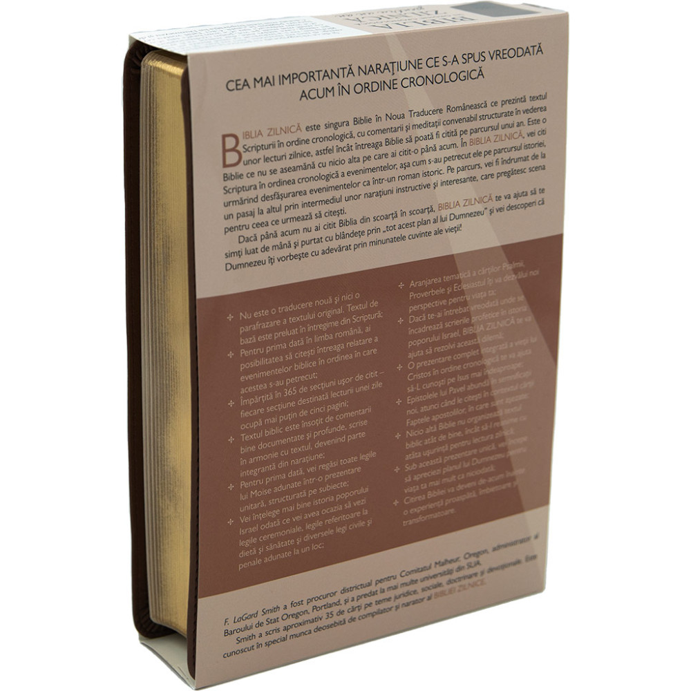 Biblia zilnica in ordine cronologica, structurata in 365 de lecturi cu meditatii care sa te indrume prin Cuvantul lui Dumnezeu cu comentarii de F. LaGard Smith. Fa-ti timp in fiecare zi sa citesti Biblia din scoarta in scoarta. Biblia zilnica te va ajuta sa te simti luat de mana si purtat cu blandete prin „tot acest plan al lui Dumnezeu” si vei descoperi ca Dumnezeu iti vorbeste cu adevarat prin minunatele cuvinte ale vietii!