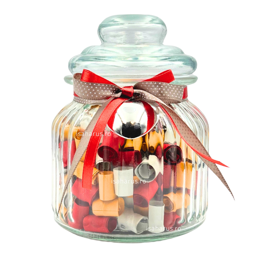 Borcanele cu versete biblice reprezintă o modalitate creativă și inspirată de a aduce cu tine în fiecare zi cuvinte încurajatoare și învățături spirituale. Fiecare borcan este meticulos creat pentru a oferi o experiență vizuală și spirituală, aducând lumină și încredere în viața cotidiană. Practic, borcanele cu versete biblice nu sunt doar obiecte decorative, ci devin surse constante de inspirație. În fiecare dimineață sau în momentele de reflecție, puteți deschide borcanul și alege un verset care să vă ghideze sau să vă ofere sprijin spiritual în cursul zilei. Așadar, aceste borcane devin nu doar accesorii frumoase, ci și instrumente care vă conectează la înțelepciunea și învățăturile sacre.