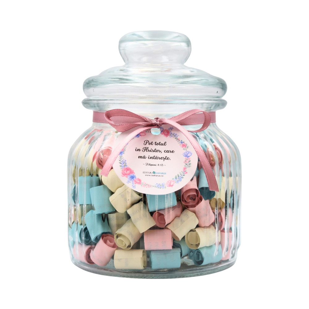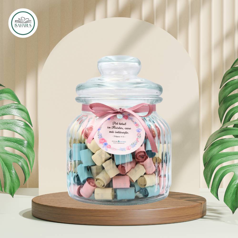 Borcanele cu versete biblice reprezintă o modalitate creativă și inspirată de a aduce cu tine în fiecare zi cuvinte încurajatoare și învățături spirituale. Fiecare borcan este meticulos creat pentru a oferi o experiență vizuală și spirituală, aducând lumină și încredere în viața cotidiană. Practic, borcanele cu versete biblice nu sunt doar obiecte decorative, ci devin surse constante de inspirație. În fiecare dimineață sau în momentele de reflecție, puteți deschide borcanul și alege un verset care să vă ghideze sau să vă ofere sprijin spiritual în cursul zilei. Așadar, aceste borcane devin nu doar accesorii frumoase, ci și instrumente care vă conectează la înțelepciunea și învățăturile sacre.