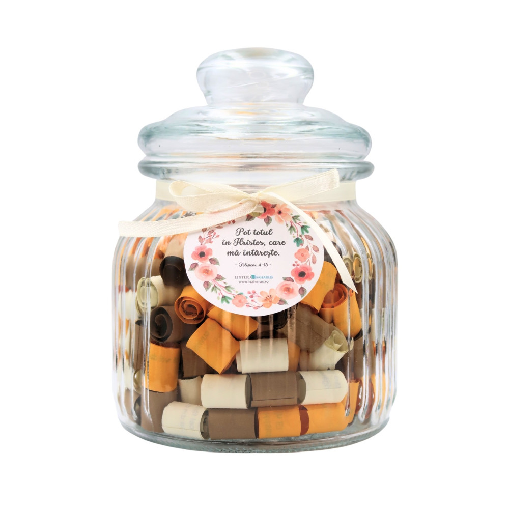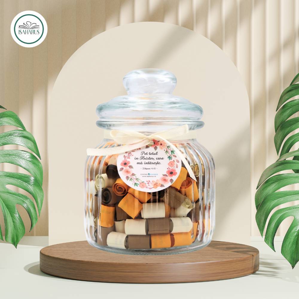 Borcanele cu versete biblice reprezintă o modalitate creativă și inspirată de a aduce cu tine în fiecare zi cuvinte încurajatoare și învățături spirituale. Fiecare borcan este meticulos creat pentru a oferi o experiență vizuală și spirituală, aducând lumină și încredere în viața cotidiană. Practic, borcanele cu versete biblice nu sunt doar obiecte decorative, ci devin surse constante de inspirație. În fiecare dimineață sau în momentele de reflecție, puteți deschide borcanul și alege un verset care să vă ghideze sau să vă ofere sprijin spiritual în cursul zilei. Așadar, aceste borcane devin nu doar accesorii frumoase, ci și instrumente care vă conectează la înțelepciunea și învățăturile sacre.