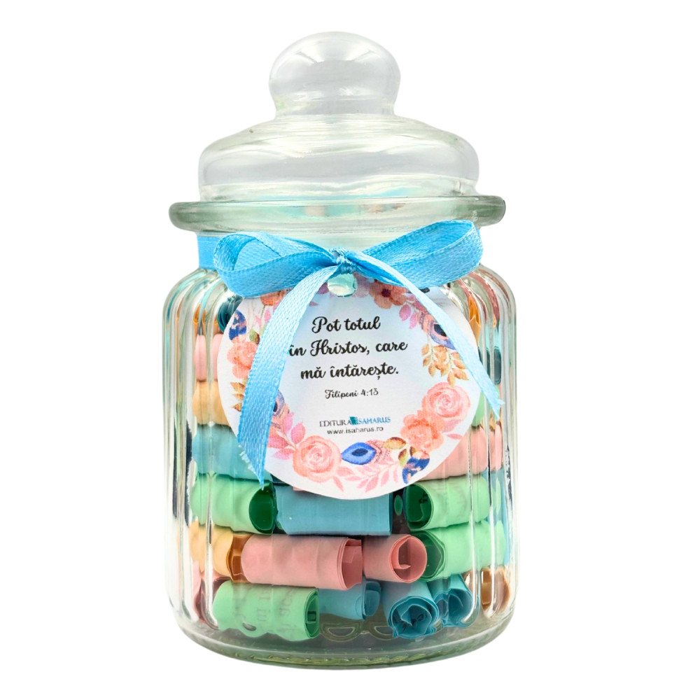 Borcanele cu versete biblice reprezintă o modalitate creativă și inspirată de a aduce cu tine în fiecare zi cuvinte încurajatoare și învățături spirituale. Fiecare borcan este meticulos creat pentru a oferi o experiență vizuală și spirituală, aducând lumină și încredere în viața cotidiană. Practic, borcanele cu versete biblice nu sunt doar obiecte decorative, ci devin surse constante de inspirație. În fiecare dimineață sau în momentele de reflecție, puteți deschide borcanul și alege un verset care să vă ghideze sau să vă ofere sprijin spiritual în cursul zilei. Așadar, aceste borcane devin nu doar accesorii frumoase, ci și instrumente care vă conectează la înțelepciunea și învățăturile sacre.