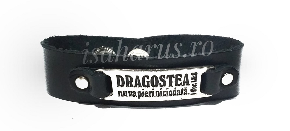 Brățară din piele de culoare neagra, inscriptionata cu mesaj creştin: „Dragostea nu va pieri niciodata.” (1 Corinteni 13:8)
