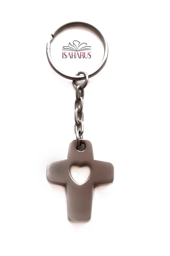 Breloc metalic în formă de cruce cu un decupaj în formă de inimă.