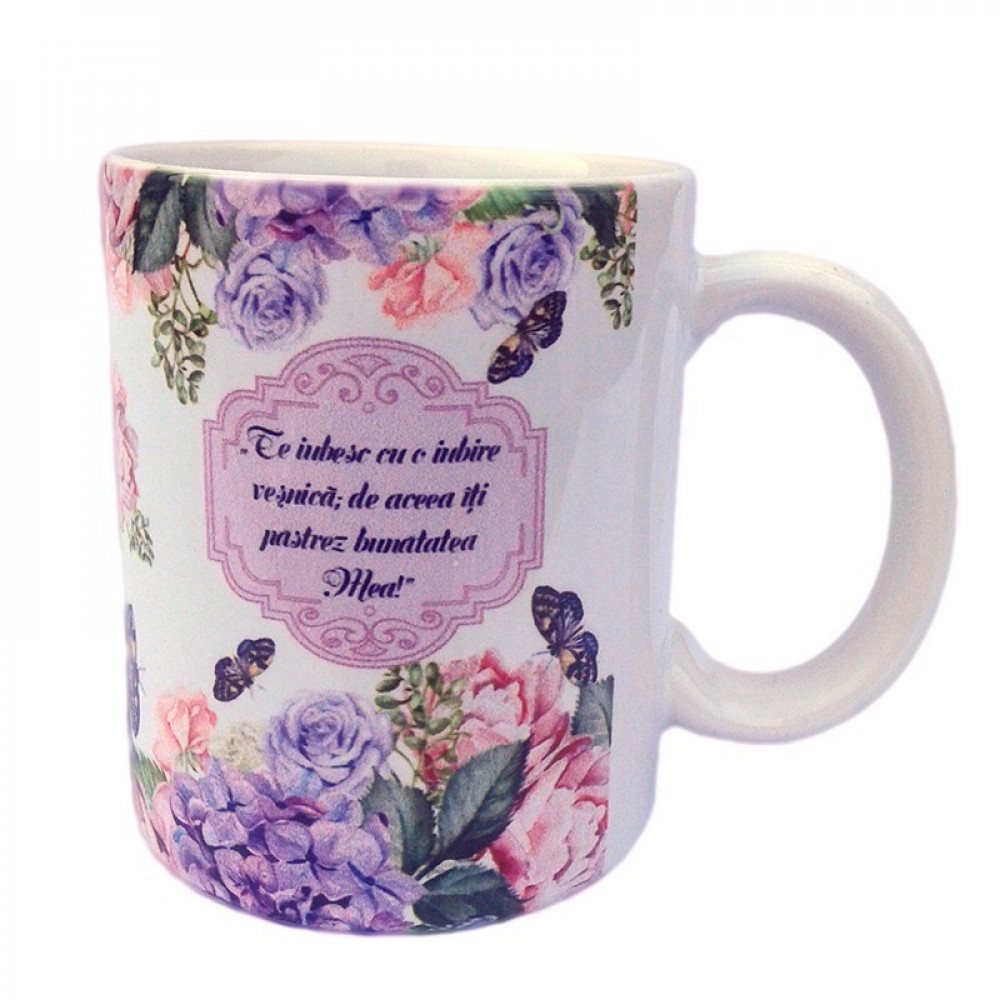 Cana din ceramica cu imprimeu floral si text biblic.