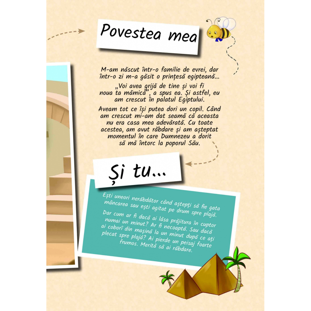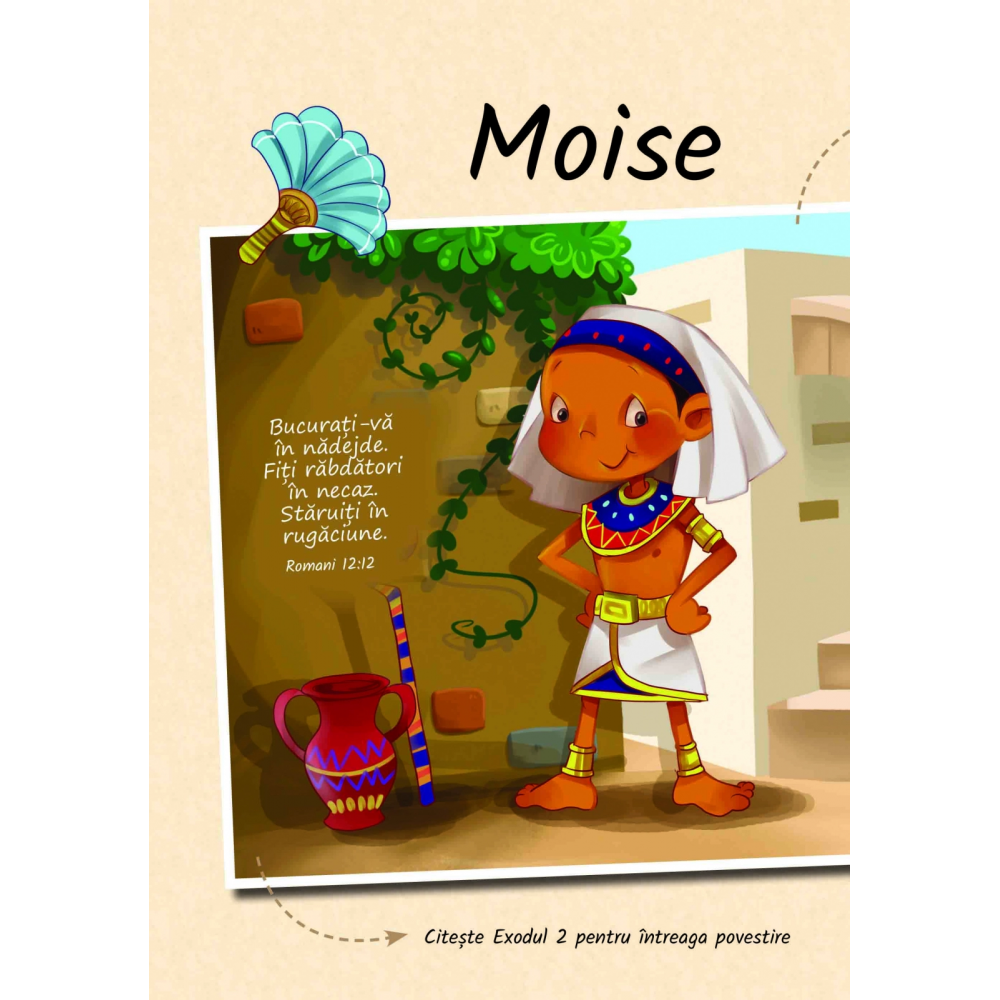 Învățăm valoarea unui caracter bun de la copiii din vremurile biblice. Cartea contine ilustrații vii și informații interesante despre viața a 12 copii din Biblie (cartea are 48 pagini din care 33 color si 15 alb-negru). Prin povestirile lor, fiecare dintre personaje dovedește o trăsătură de caracter specifică și ne oferă câteva exemple ajutătoare despre modul în care și copiii de azi pot juca un rol important făcând ceva pentru Dumnezeu.