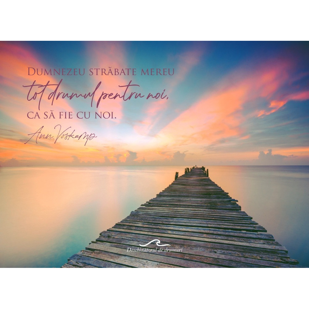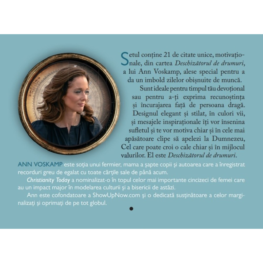 Aceste carduri sunt rezultatul unei selectii de citate dintre cele mai cunoscute ale lui Ann Voskamp din cartea Deschizatorul de drumuri. Setul contine 21 de carduri full-color cu cate un mesaj motivational pentru fiecare zi in care te pregatesti pentru o noua zi de munca sau pentru a transmite un gand bun si incurajator cuiva drag. Pot fi oferite si sub forma de felicitare sau, pur si simplu, ca un semn de carte.