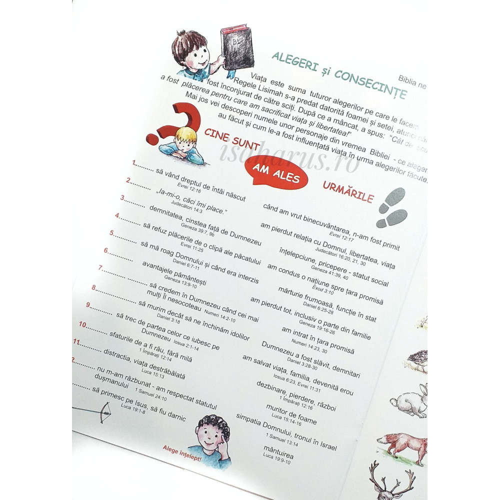 Stim cu totii ca profesia este una dintre cele mai importante alegeri ale vietii, fiindca meseria ne influenteaza nu doar viata pamanteasca, ci si vesniciea. In „Meseriile oamenilor Bibliei” veti intalni multe personaje din vremea biblica, meseriile pe care ei le-au practicat si cum le-a fost influentata viata datorita profesiei. Agricultor, fierar, cioban, scrib, preot, avocat sunt doar cateva din meseriile discutate in aceasta serie de lectii biblice. Parcurgand impreuna cu copilul aceasta serie de povestiri, veti avea ocazia sa dezbateti subiecte interesante in privinta orientarii profesionale a copilului dumneavoastra. ii puteti oferi o imagine de ansamblu a ceea ce presupune aceasta alegere importanta. meseria! Ca parinte, poate trebuie sa incurajati mai mult inclinatiile copilului sau sa lucrati la corectarea lor. Nu pregetati la aceasta, copilaria este momentul in care se construiește caracterul, iar alegerile copilului vor fi influentate de ceea ce s-a construit in el. Amintiti-le in fiecare zi ca Biblia le recomanda: „Sa lucreze cu mainile lor la ceva bun.” (Efeseni 4:28)