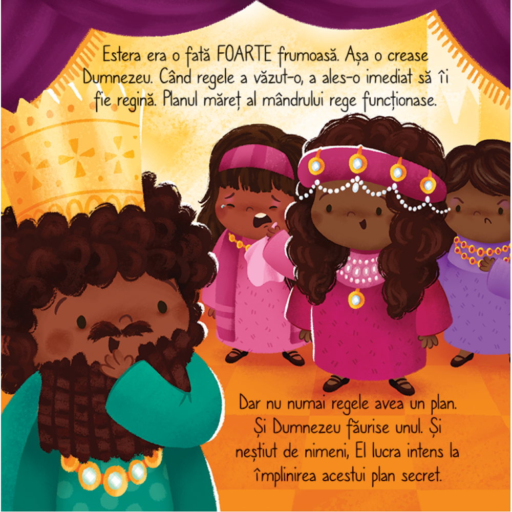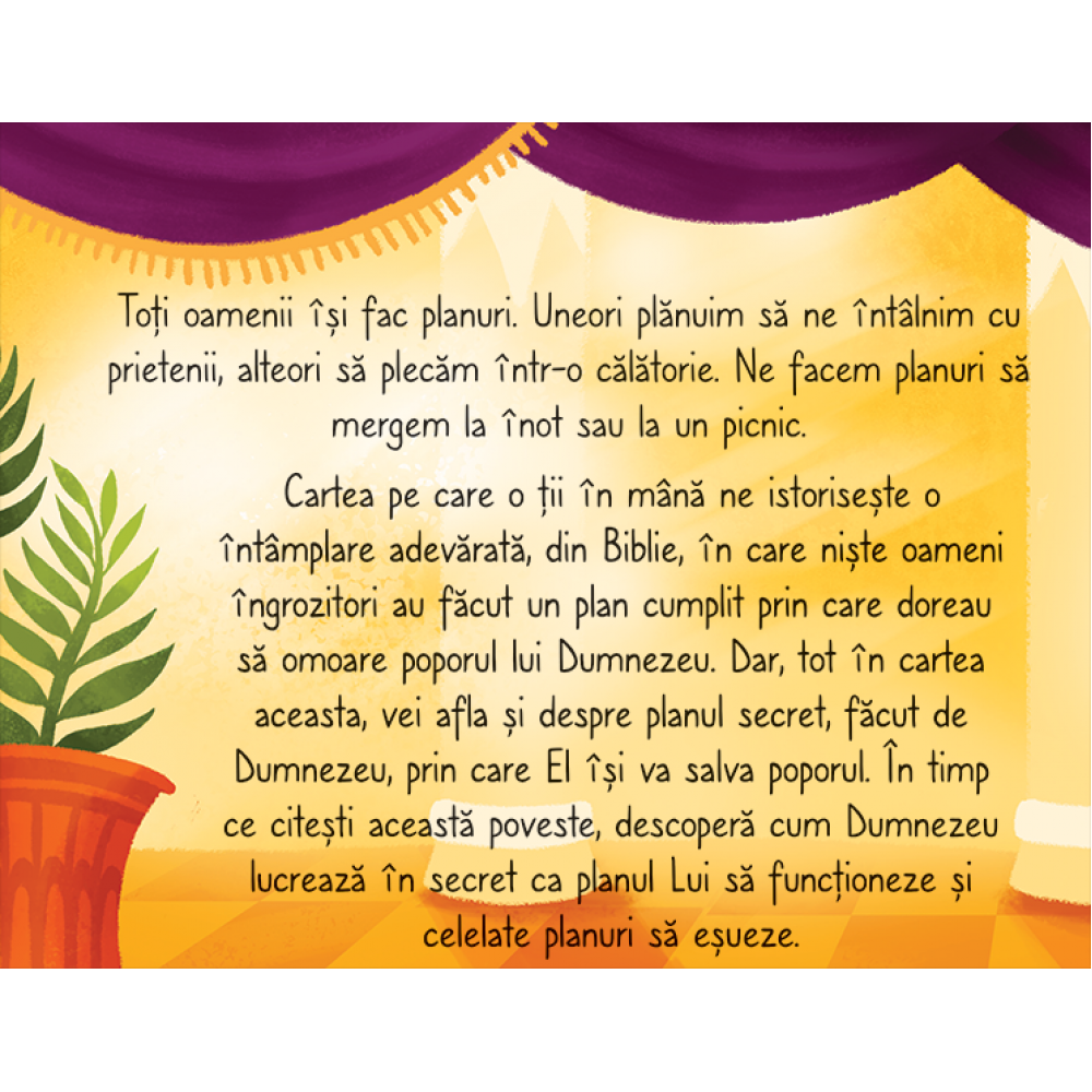 Oare ce se va intampla atunci cand regina Estera va risca totul pentru a opri un complot ingrozitor? Va capata ea trecere sau va fi pedepsita? Descoperim, in aceasta relatare fidela si amuzanta a povestirii biblice, cum Dumnezeu a folosit-o pe Estera pentru a-si pazi poporul de un plan marsav. Aflam astfel ca planurile lui Dumnezeu de a-si salva copiii nu esueaza niciodata.