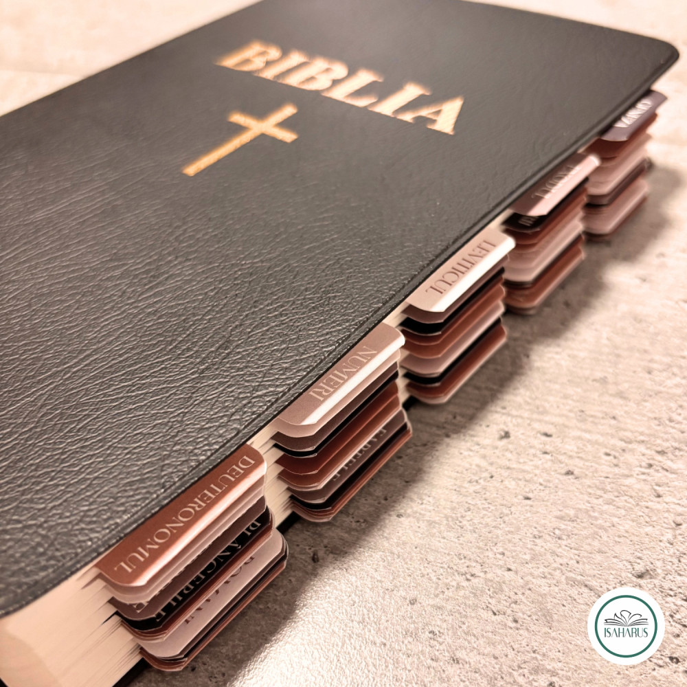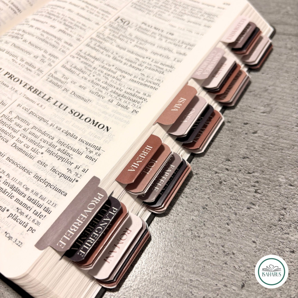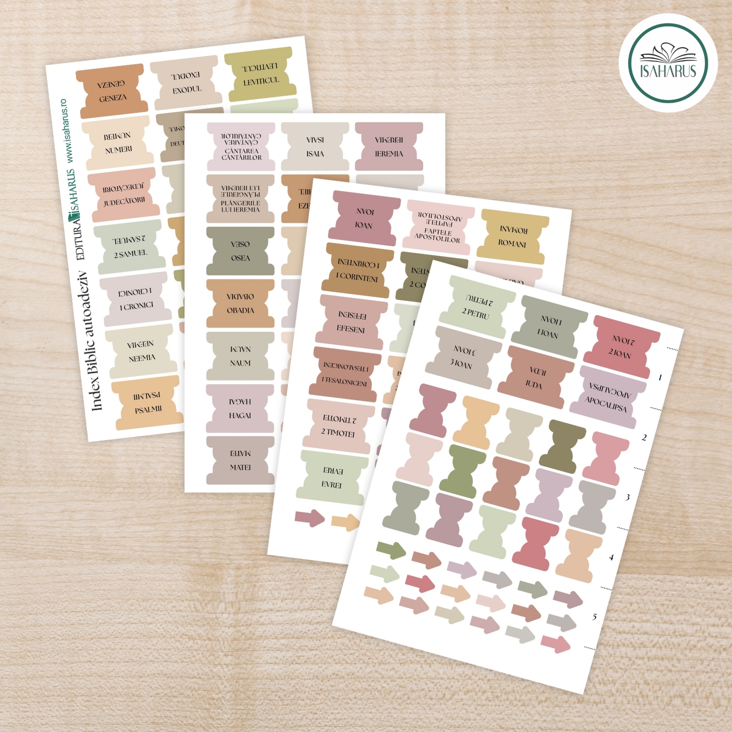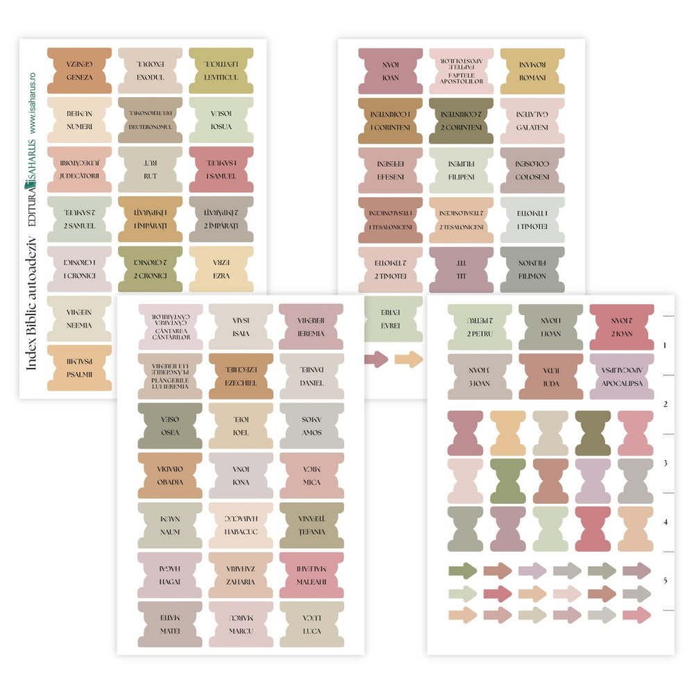 Index biblic autoadeziv, în limba română, foarte ușor de aplicat pe filele Bibliei cu ajutorul grilei de ghidaj. Setul conține 4 coli cu toate cărțile Bibliei, atât pentru Vechiul Testament, cât și pentru Noul Testament, dar și câteva elemente extra ce pot fi lipite în Biblie pentru a indica versete sau pasaje preferate.