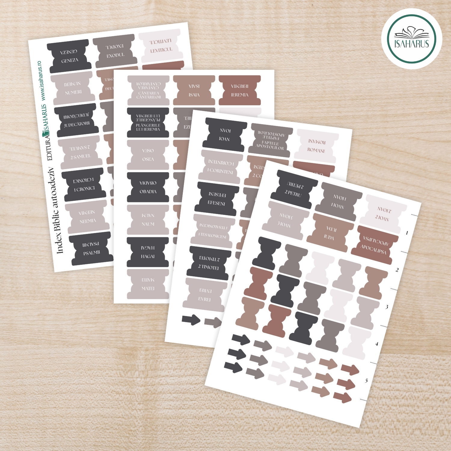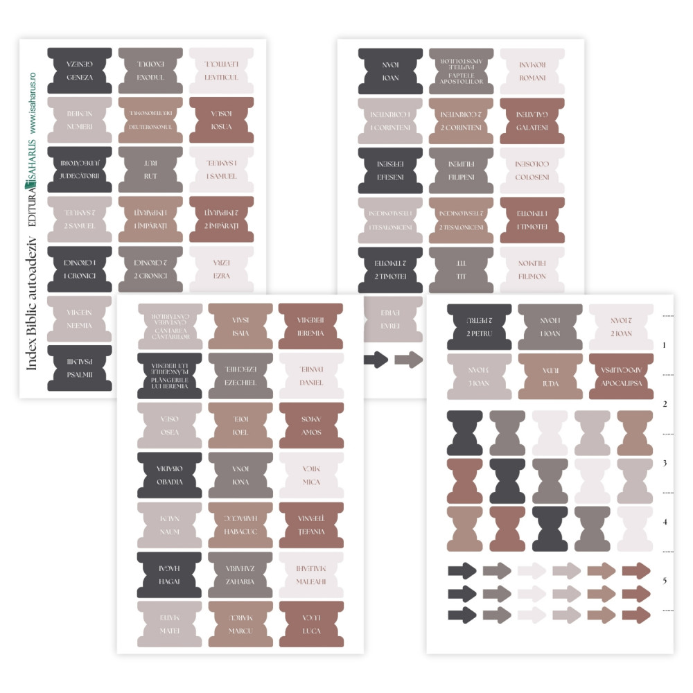 Index biblic autoadeziv, în limba română, foarte ușor de aplicat pe filele Bibliei cu ajutorul grilei de ghidaj. Setul conține 4 coli cu toate cărțile Bibliei, atât pentru Vechiul Testament, cât și pentru Noul Testament, dar și câteva elemente extra ce pot fi lipite în Biblie pentru a indica versete sau pasaje preferate.