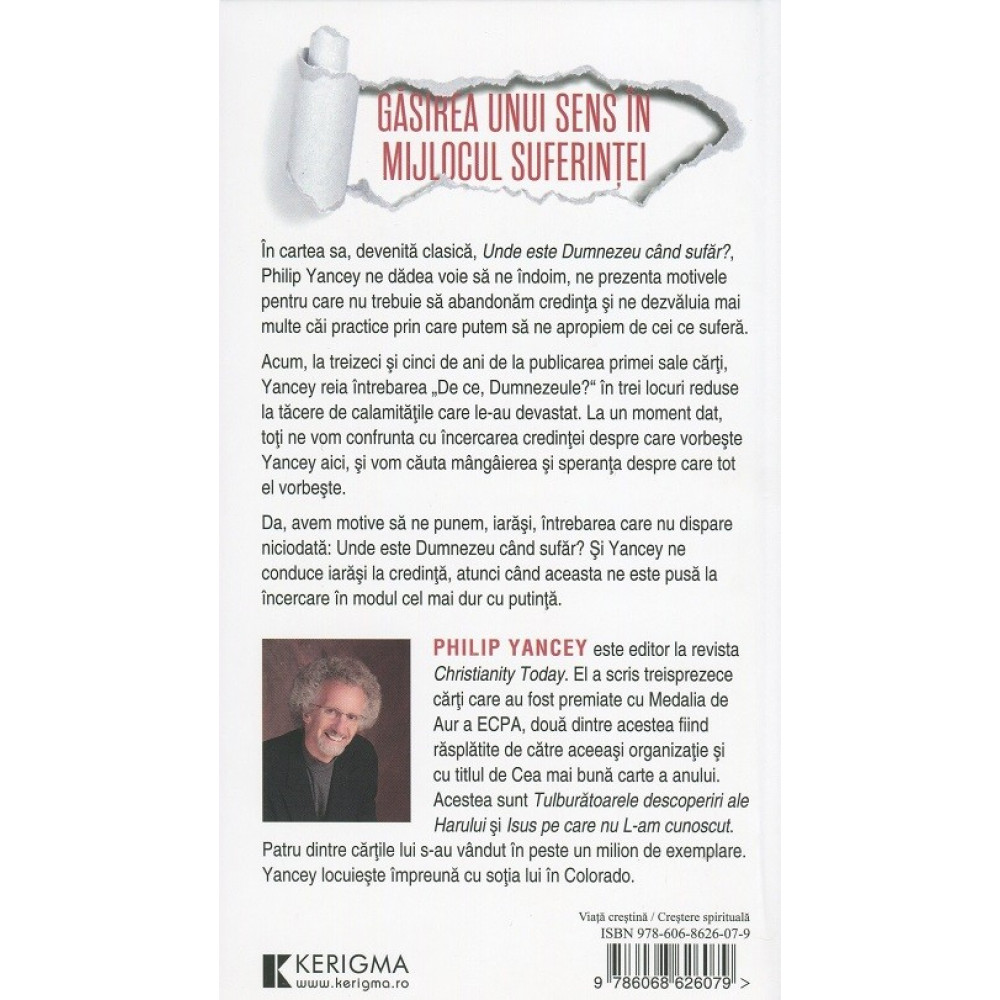 In cartea sa, devenita clasica, "Unde este Dumnezeu cand sufar?", Philip Yancey ne dadea voie sa ne indoim, ne prezenta motivele pentru care nu trebuie sa abandonam credinta si ne dezvaluia mai multe cai practice prin care putem sa ne apropiem de cei ce sufera. Acum, la treizeci si cinci de ani de la publicarea primei sale carti, Yancey reia intrebarea "De ce, Dumnezeule?" in trei locuri reduse la tacere de calamitatile care le-au devastat. La un moment dat, toti ne vom confrunta cu incercarea credintei despre care vorbeste Yancey aici, si vom cauta mangaierea si speranta despre care tot el vorbeste.Da, avem motive sa ne punem, iarasi, intrebarea care nu dispare niciodata: Unde este Dumnezeu cand sufar? Si Yancey ne conduce iarasi la credinta, atunci cand aceasta ne este pusa la incercare in modul cel mai dur cu putinta.