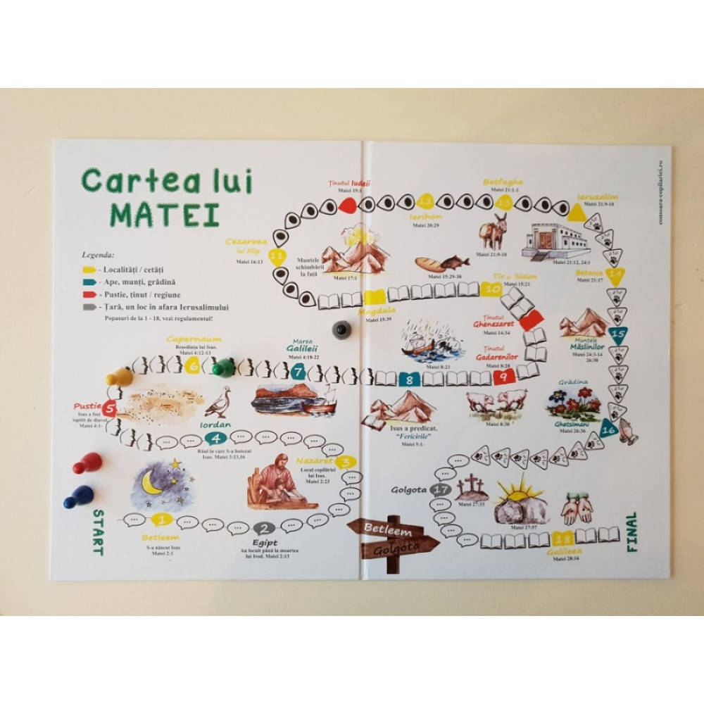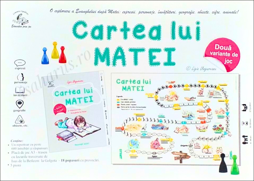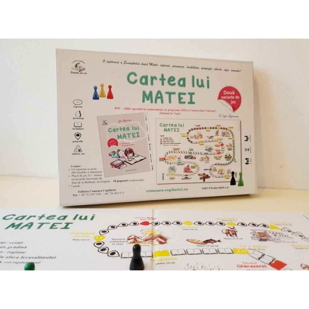 Cartea lui Matei este un joc, o călătorie în istoria Bibliei, pe urmele Mântuitorului. Vei cunoaște locurile pe care a mers în călătoria Sa, de la Betleem la Golgota. Traseul călătoriei este reprezentat pe o placă de joc, de dimensiunea A3, unde sunt specificate locurile prin care a trecut Isus potrivit evanghelistului Matei. Pe traseu vei avea parte de 18 popasuri cu provocări.