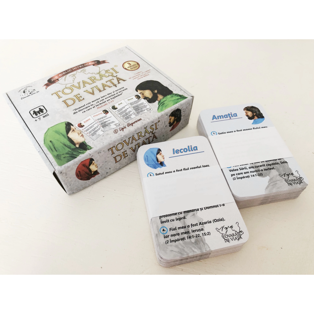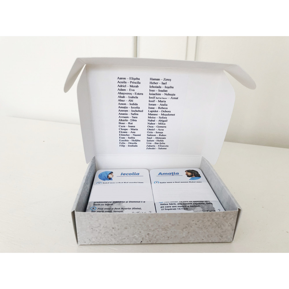 A pornit de la cuvintele lui Maleahi: „…Domnul a fost martor între tine şi nevasta din tinereţea ta, … că este tovarăşa şi nevasta cu care ai încheiat legământ!” (Maleahi 2:14). Vrei să transmiți valori precum, familia, care este căsătoria dintre un bărbat și o femeie? Familia datează din cele mai vechi timpuri. Vrei să cunoști familii care au scris istoria Bibliei? Prin acest joc vei face cunoștință cu 45 de cupluri din istoria Bibliei și detalii despre viețile lor. Se adresează copiilor cu vârste + 7 ani, prinde bine însă și adulților, o ocazie nimerită de a duce împreună copiii cu părinți, bunici.