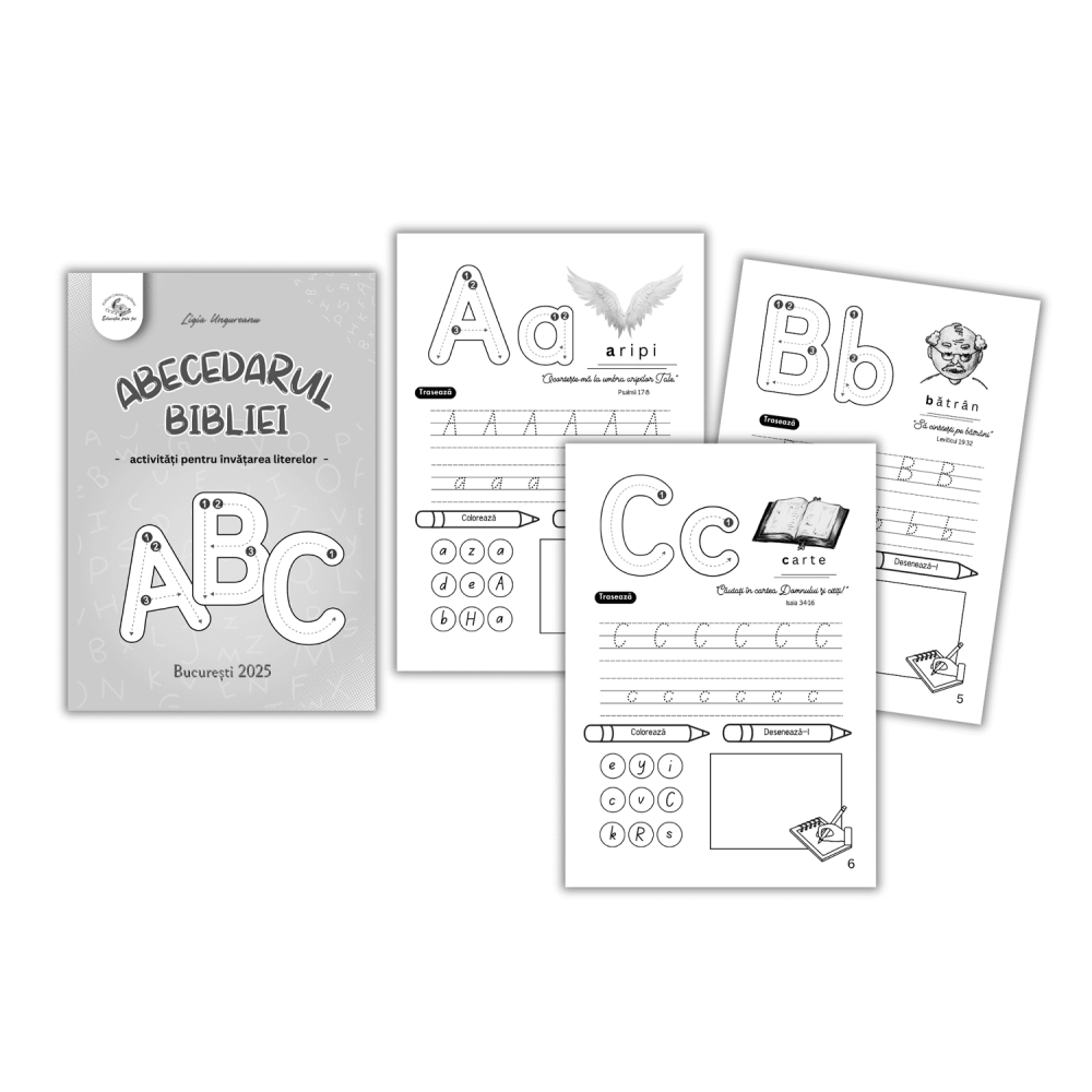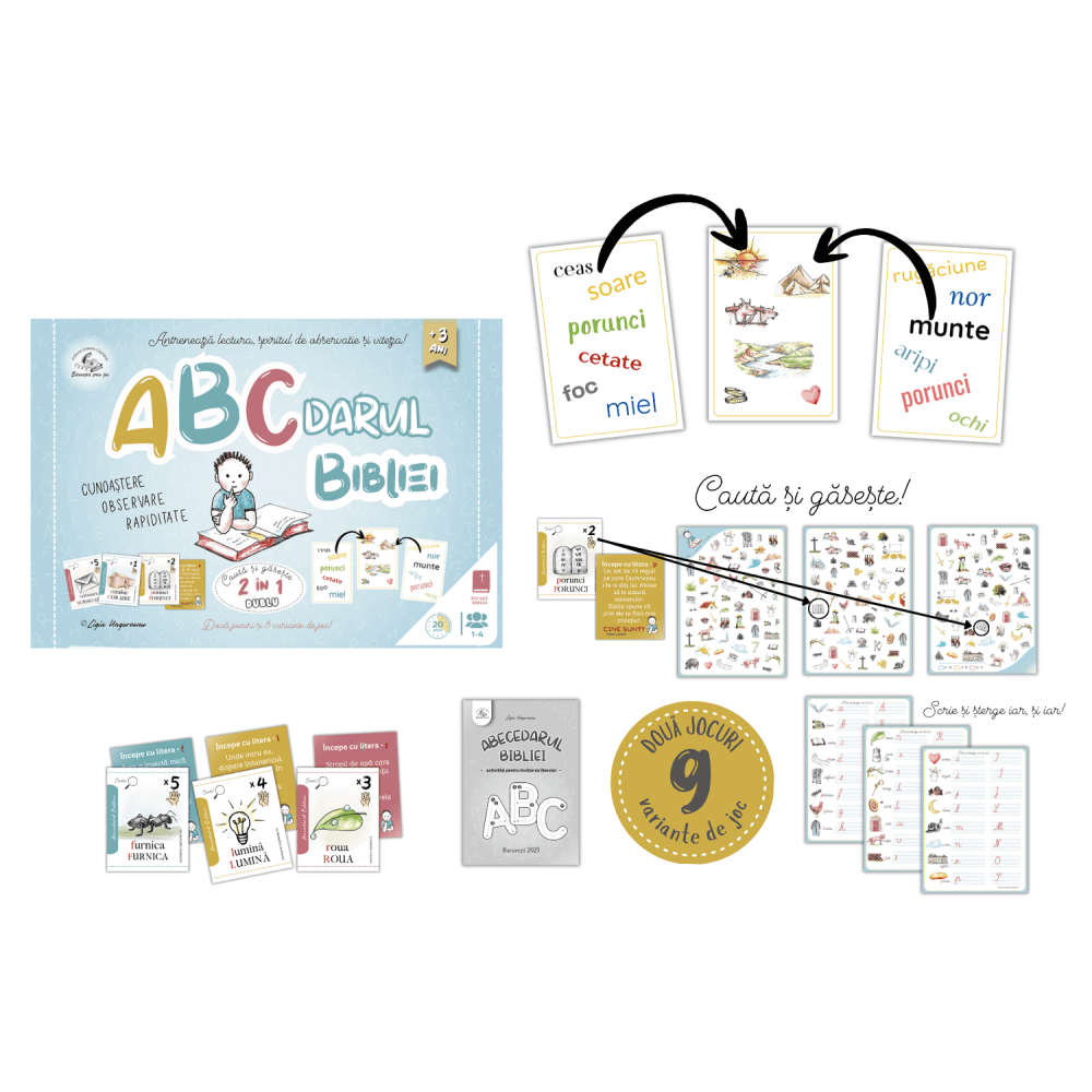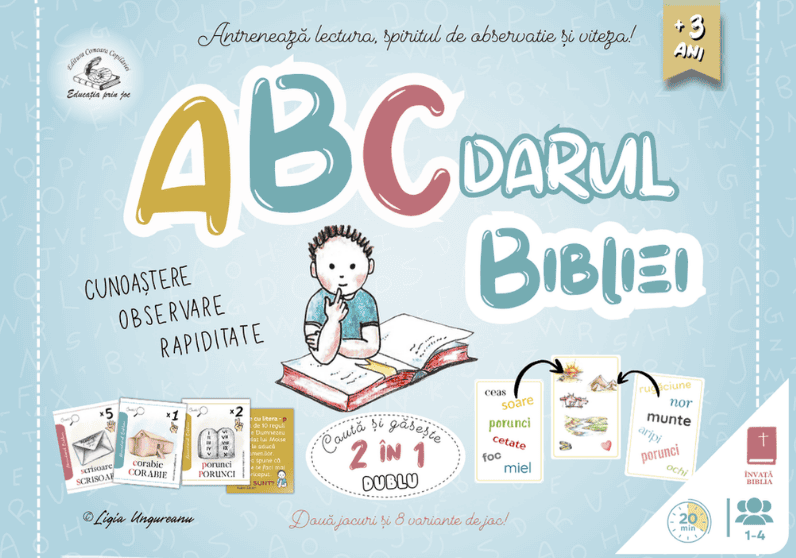 Abecedarul Biblei conține două jocuri excelente pentru învățarea alfabetului și pentru pregătirea copilului în vederea învățării scrisului și cititului. Totodată se potrivește minunat atât școlarilor cât pentru toată familia. Pot fi explorate în 9 variante de joc. Jocuri integrate cu Biblia. Jocul DUBLU și CAUTĂ și GĂSEȘTE! Variantele de joc pentru DUBLU, le găsești pe cartonașe. Toate cuvintele și imaginile aferente lor, de la A la Z se împart în: monosilabe și silabe.