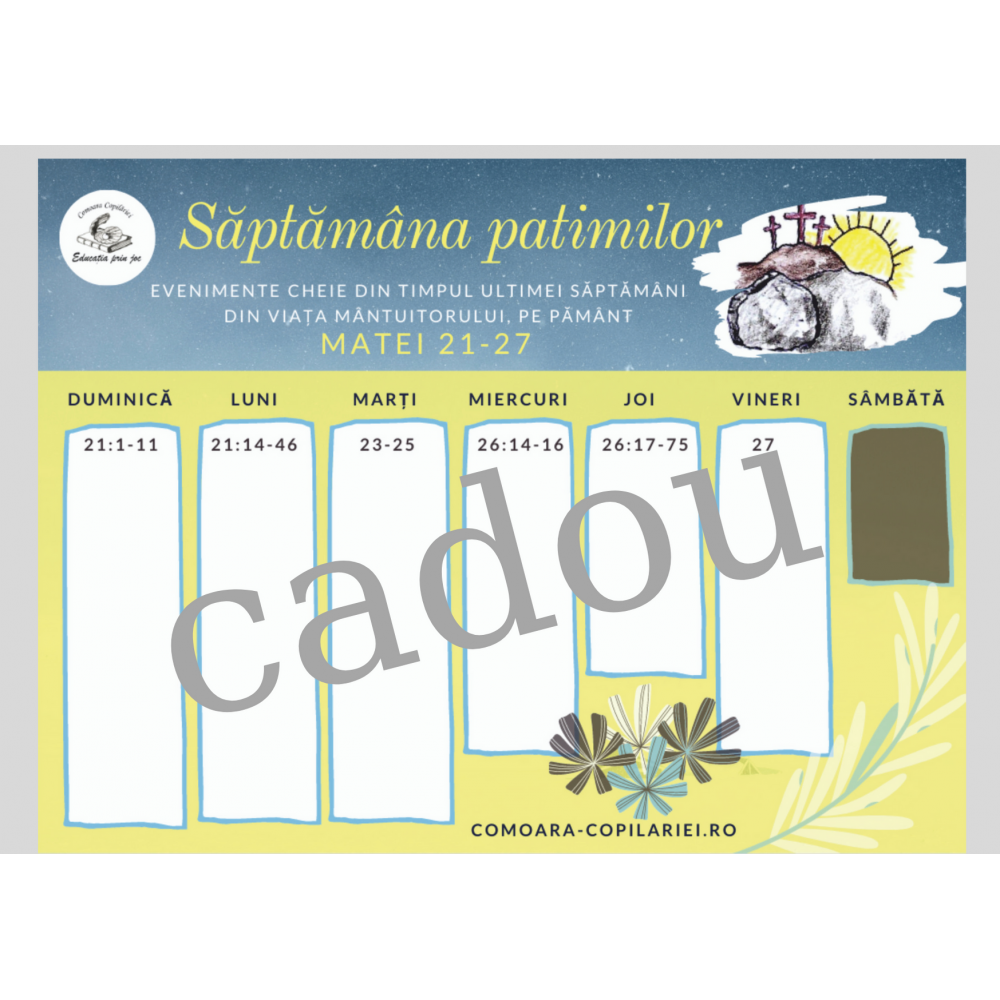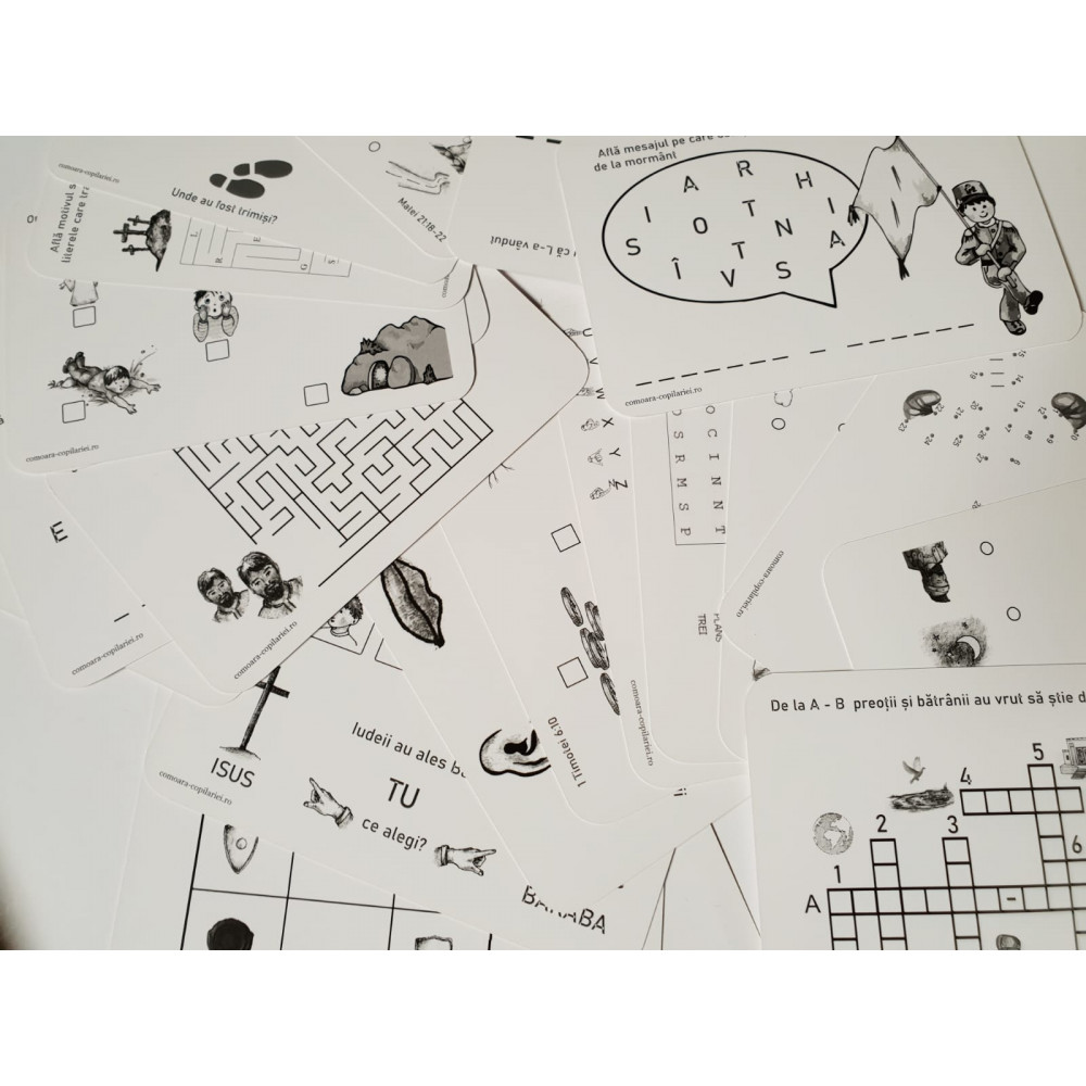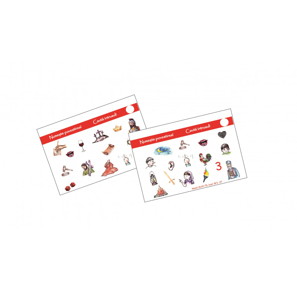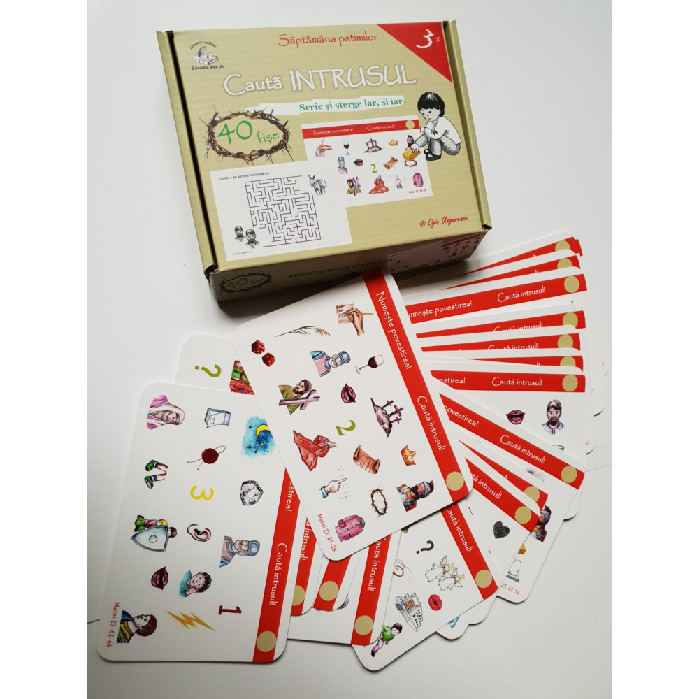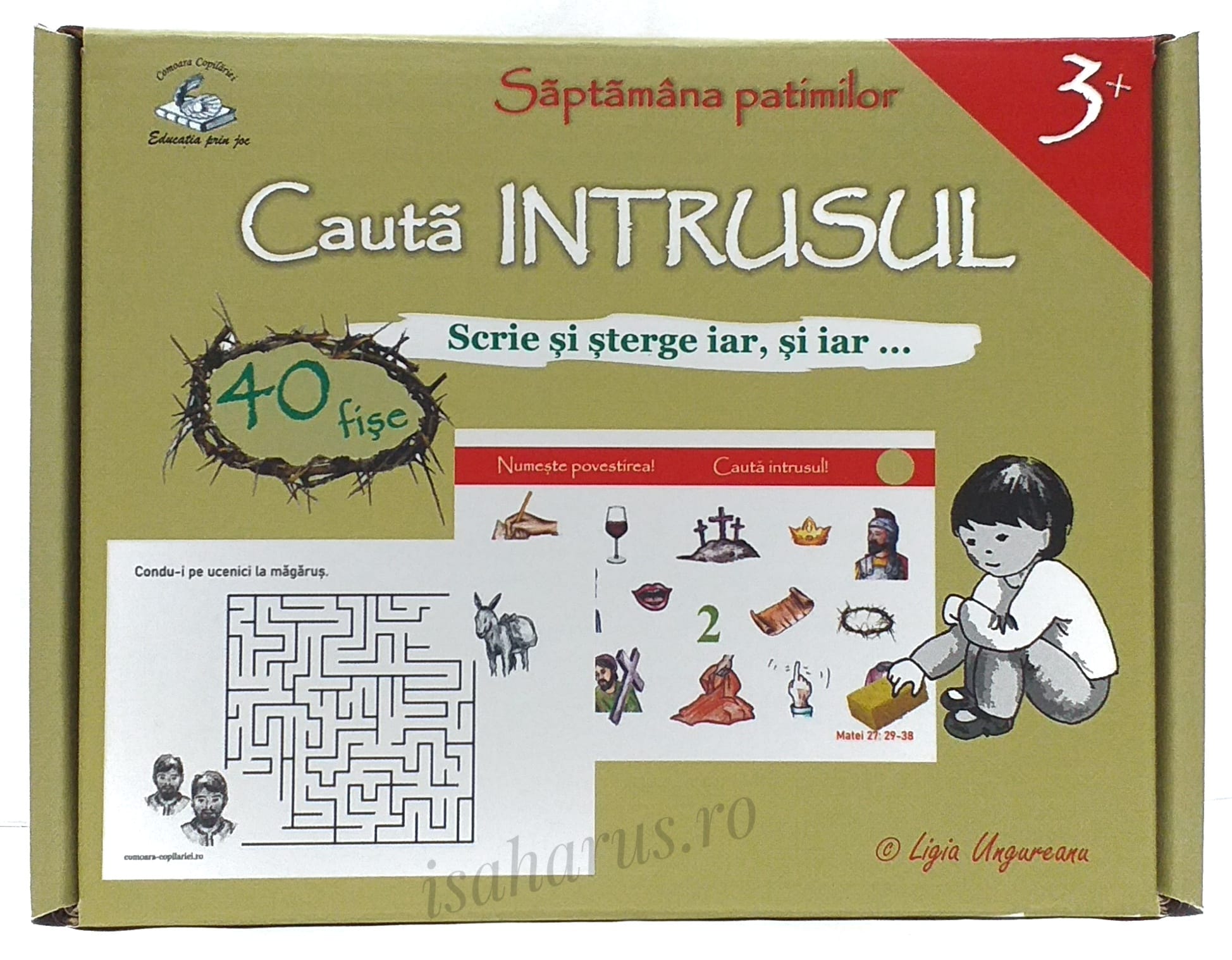 Caută intrusul, săptămâna patimilor, este un joc excelent prin care poți evalua cât și consolida cunoștințele despre evenimentele din ultima săptămână de viață pe pământ, a Mântuitorului. Gradul de dificultate al activităților este de la simplu la complex. Se adresează copiilor cu vârste + 3 ani, poate fi însă foarte nimerit adolescenților și chiar adulților, o ocazie minunată de a duce împreună copiii cu părinți, bunici, etc. Un excelent cadou de Paște, la ziua de naștere, la concursuri biblice, olimpiade de religie, sau premieri în cadrul școlii duminicale, etc.