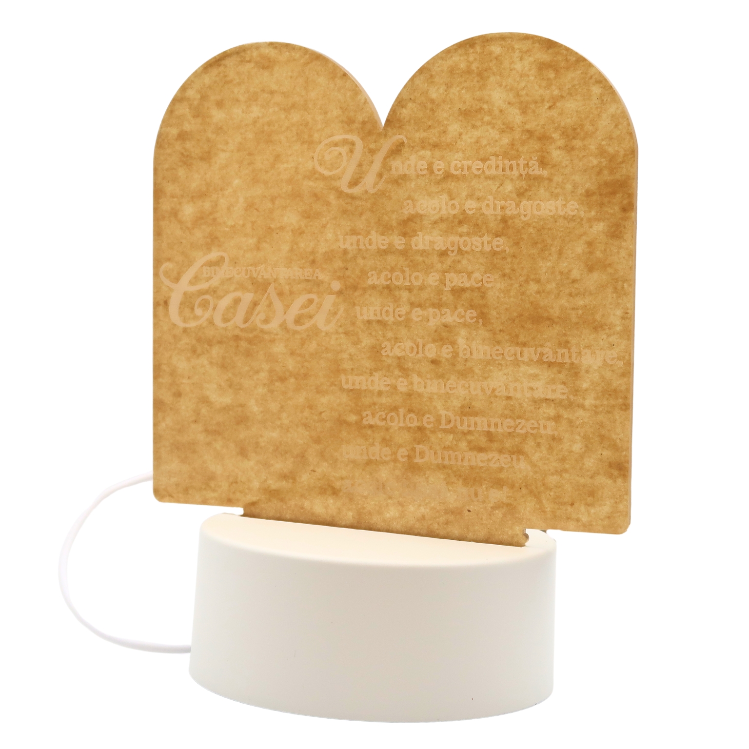 Această lampă de veghe simbolică aduce o lumină caldă și o atmosferă liniștită în casa ta, fiind inscripționată cu textul plin de semnificație al Binecuvântării casei. Ideală pentru a exprima credința și protecția divină, este o alegere perfectă pentru decorarea locuinței. Formă delicată de carte deschisă, inscripție clară și precisă, iluminare blândă, care oferă un ambient plăcut și reconfortant. Dimensiuni compacte, potrivite pentru noptiere, rafturi sau mese de hol. Oferă o notă specială de credință și dragoste în dar pentru prieteni, familie sau ocazii speciale, cum ar fi mutarea într-o casă nouă, aniversările sau sărbătorile religioase. Această lampă de veghe nu este doar o sursă de lumină, ci și un simbol al binecuvântării și al păcii care domnesc în fiecare casă.