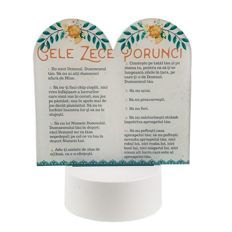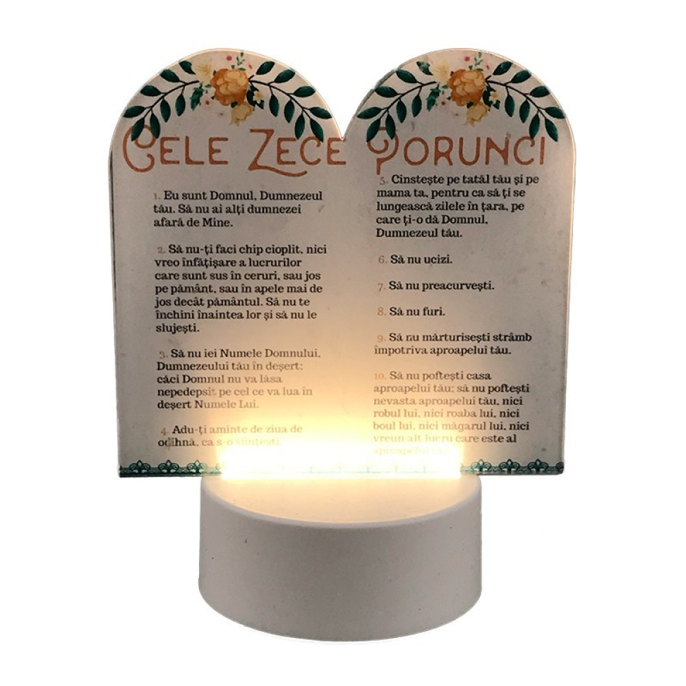 Această lampă de veghe simbolică aduce o lumină caldă și o atmosferă liniștită în casa ta, fiind inscripționată cu textul plin de semnificație al celor zece porunci. Ideală pentru a exprima credința și protecția divină, este o alegere perfectă pentru decorarea locuinței. Formă delicată de carte deschisă, inscripție clară și precisă, iluminare blândă, care oferă un ambient plăcut și reconfortant. Dimensiuni compacte, potrivite pentru noptiere, rafturi sau mese de hol. Oferă o notă specială de credință și dragoste în dar pentru prieteni, familie sau ocazii speciale, cum ar fi aniversările sau sărbătorile religioase. Această lampă de veghe nu este doar o sursă de lumină, ci și un simbol al binecuvântării și al păcii care domnesc în fiecare casă.