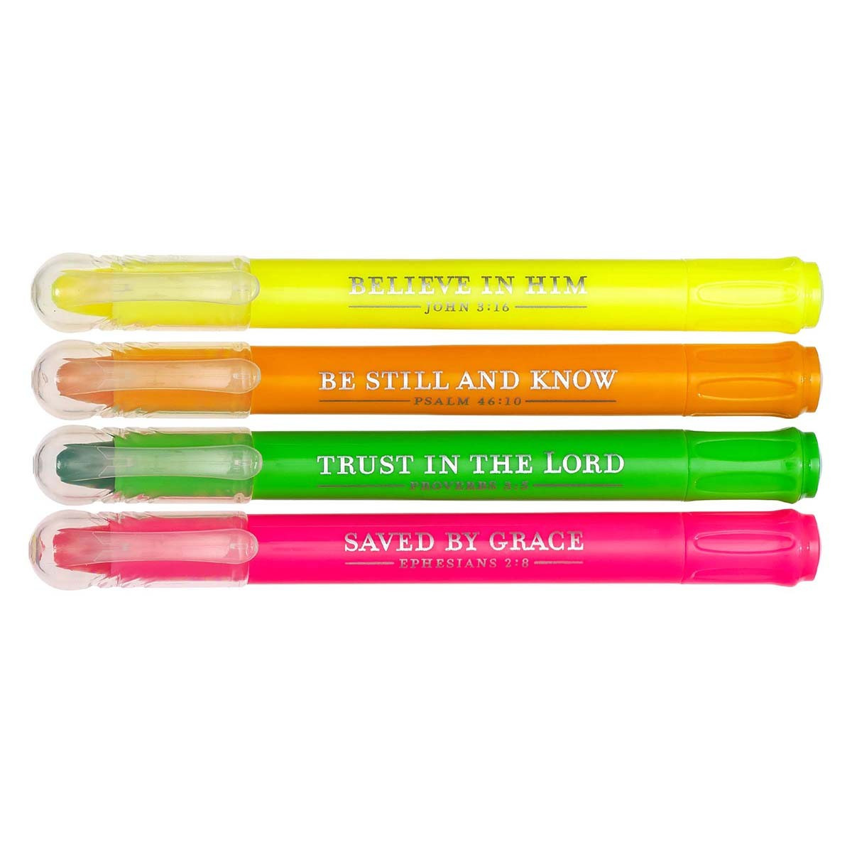 Setul cuprinde 4 creioane cu mină gelată, non-toxică, în nuanțele: roz, verde, portocaliu și galben. Pe fiecare creion este inscripționat un verset biblic în limba engleză.