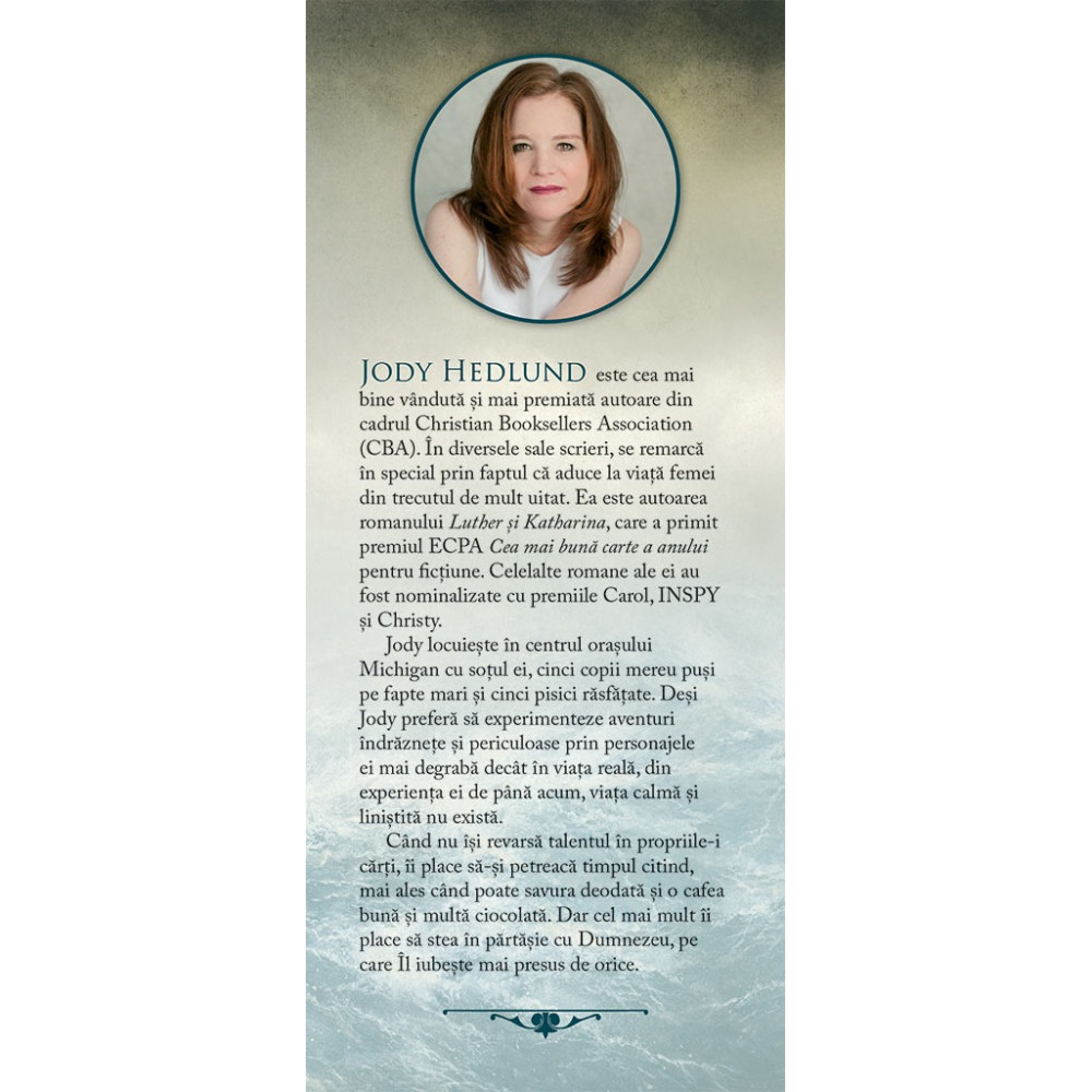 Jody Hedlund este cea mai bine vanduta si mai premiata autoare din cadrul Christian Booksellers Association (CBA). In diversele sale scrieri, se remarca in special prin faptul ca aduce la viata femei din trecutul de mult uitat. Ea este autoarea romanului Luther si Katharina, care a primit premiul ECPA cea mai buna carte a anului pentru fictiune. Celelalte romane ale ei au fost nominalizate cu premiile Carol, INSPY si Christy. Jody locuieste in centrul orasului Michigan cu sotul ei, cinci copii mereu pusi pe fapte mari si cinci pisici rasfatate. Desi Jody prefera sa experimenteze aventuri indraznete si periculoase prin personajele ei mai degraba decat in viata reala, din experienta ei de pana acum, viata calma si linistita nu exista. Cand nu isi revarsa talentul in propriile-i carti, ii place sa-si petreaca timpul citind, mai ales cand poate savura deodata si o cafea buna si multa ciocolata. Dar cel mai mult ii place sa stea in partasie cu Dumnezeu, pe care Il iubeste mai presus de orice.