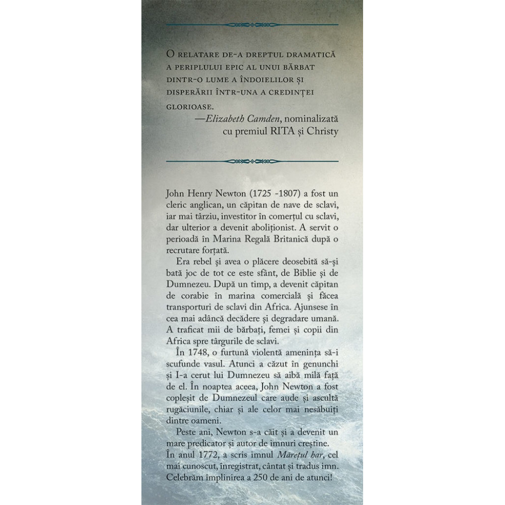 Cunoscut astazi ca autorul celui mai renumit imn din lume, John Newton nu era decat un tanar marinar pribegind fara tinta prin viata, pe la mijlocul secolului al XVIII-lea, cand Anglia si Franta se aflau pe picior de razboi. Singurele responsabilitati pe care si le-a asumat au fost de a se prezenta pe vas si de a nu-si face tatal de ocara – asta pana intr-o noapte cand aude glasul fascinant al lui Polly Catlett cantand colinde. E cucerit pe loc de ea si hotaraste sa-i castige dragostea. Intre cei doi se leaga numaidecat o relatie intensa, dar spiritul nesabuit si lipsa de consideratie fata de viata crestina a lui John o ingrijoreaza pe Polly cea responsabila si evlavioasa. Cand in timpul unui popas pagubos la carciuma, John este saltat si aruncat in temnita, Polly trebuie sa aleaga fie sa ramana alaturi de el, fie sa iasa din viata lui pentru totdeauna. Isi va pune ea viitorul in joc pentru barbatul pe care il iubeste? Intoarce-te in istorie, prin intermediul acestor pagini, ca sa descoperi adevarata poveste de dragoste din spatele imnului care continua sa inflacareze inimi si sa aprinda credinta milioanelor de oameni din intreaga lume. O relatare de-a dreptul dramatica a periplului epic al unui barbat dintr-o lume a indoielilor si disperarii intr una a credintei glorioase.